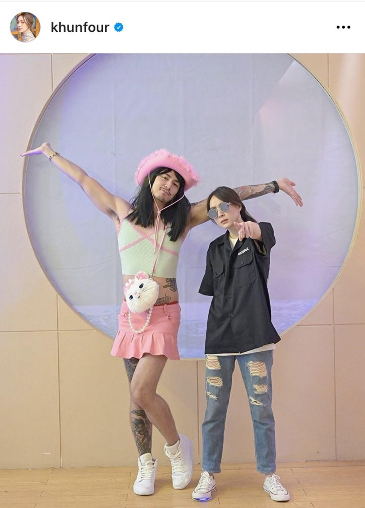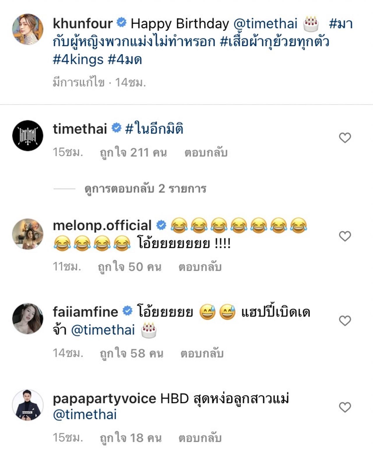 โดย ธามไท ได้แต่งตัวเป็นผู้หญิงผมยาว ในชุดสีชมพูสุดมุ้งมิ้ง ส่วน โฟร์ ในมาในชุดอาชีวะ ใส่กางเกงยีนส์เสื้อช็อปแบบแมนๆ พร้อมกับเขียนแคปชั่นว่า "Happy Birthday @timethai #มากับผู้หญิงพวกแม่งไม่ทำหรอก #เสื้อผ้ากุย้วยทุกตัว #4kings #4มด" ด้าน ธามไท ก็ได้เข้ามาคอมเมนต์ตอบกลับว่า "ในอีกมิติ"