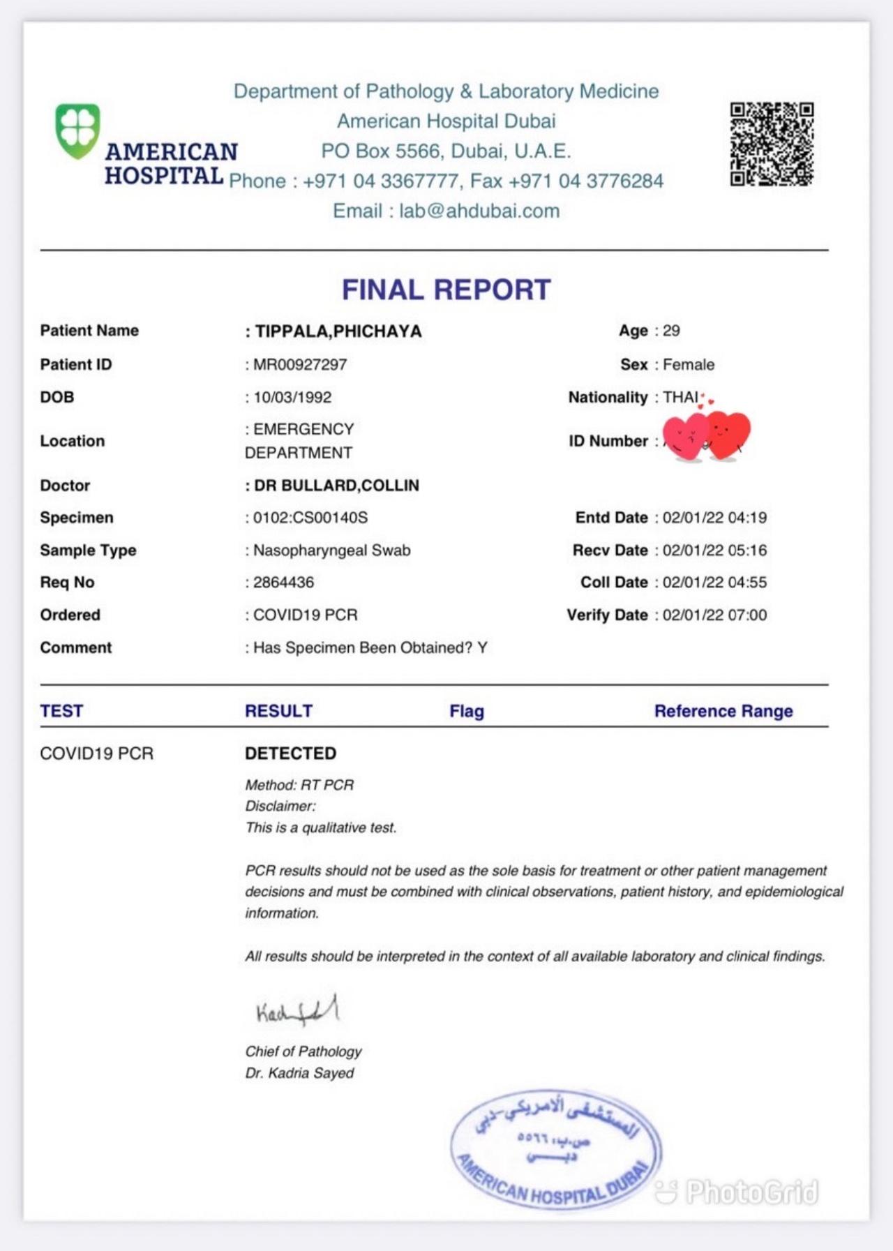 วันที่ 2 มกราคม 2565 ลองตรวจ ATK เองก่อน ผลเป็นบวก รีบไป รพ. ตรวจ PCR อีกรอบ ผลออกมาบวก สรุปติดโควิดอยู่ดูไบ จากการคาดเดาคิดว่าน่าจะติดเชื้อมาจากที่นิวยอร์ก.