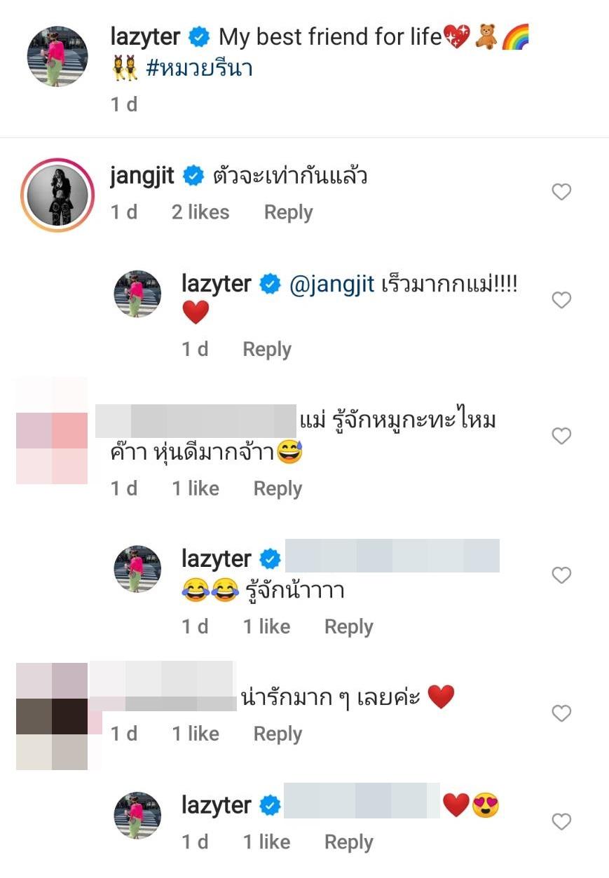 ท่ามกลางคอมเมนต์จากแฟนๆ อาทิ แม่ รู้จักหมูกระทะไหมค๊าา หุ่นดีมากจ้าา, น่ารักมากๆ เลยค่ะ, น้องรีนาจะสูงเท่าหม่ามี๊แล้ว ฯลฯ ด้านแจง ปุณณาสา ภรรยาแจ๊ส ชวนชื่น ก็เข้ามาคอมเมนต์แซวว่า “ตัวจะเท่ากันแล้ว” และเธอตอบกลับว่า “เร็วมากกแม่!!!!”.