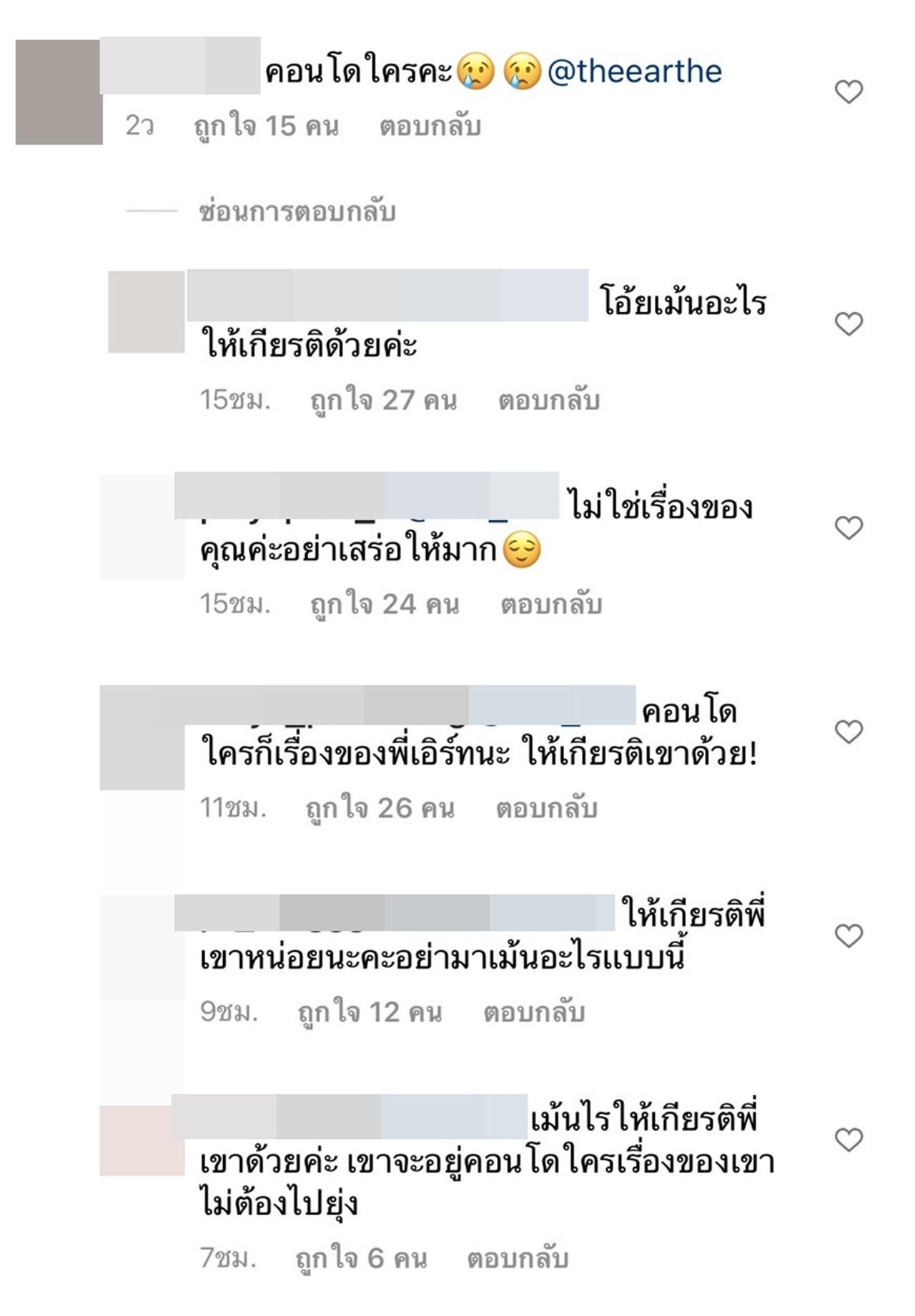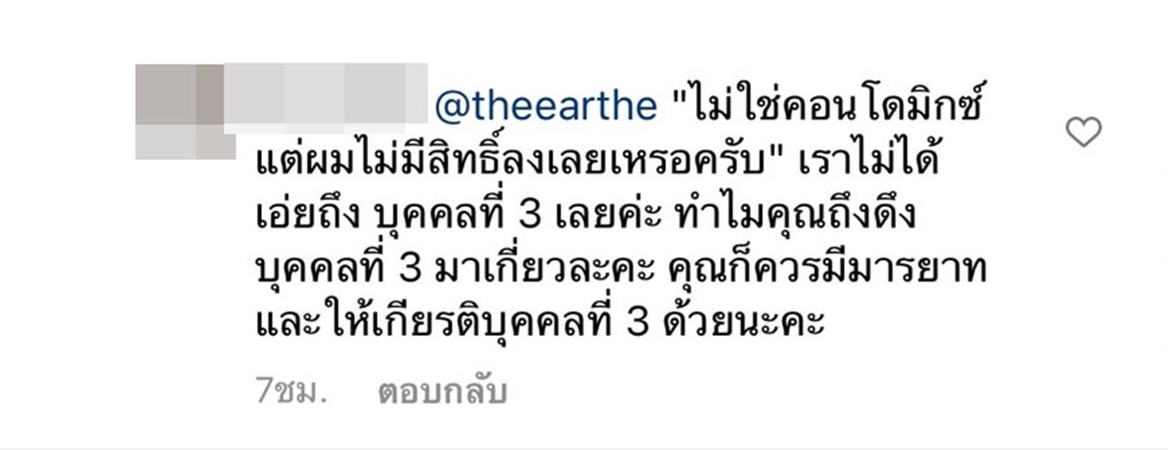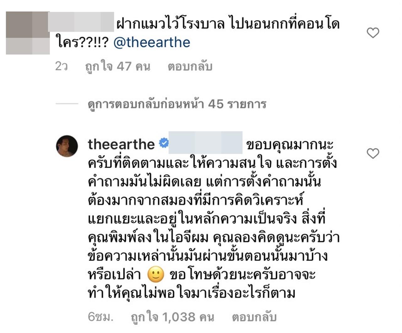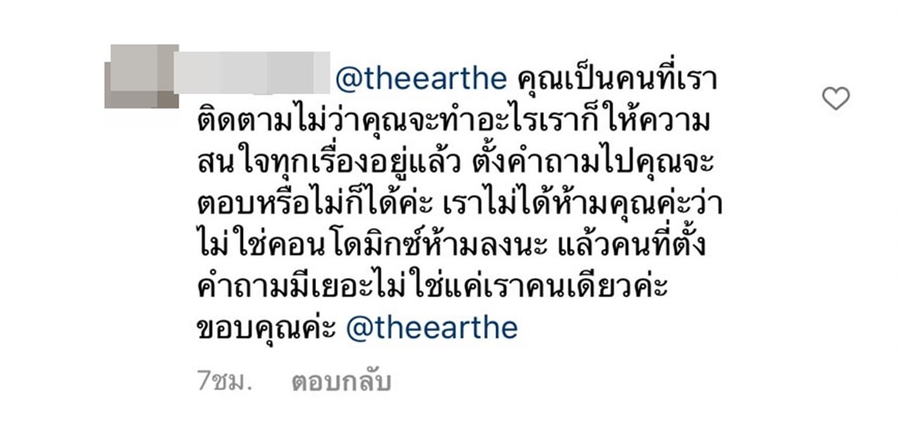 จากนั้นก็มีชาวเน็ตคนอื่นๆ เข้ามาคอมเมนต์ในเชิงตำหนิพฤติกรรมของชาวเน็ตคนดังกล่าวที่เข้ามาถามคำถามนี้กับหนุ่มเอิร์ทในอินสตาแกรมอย่างมากมาย