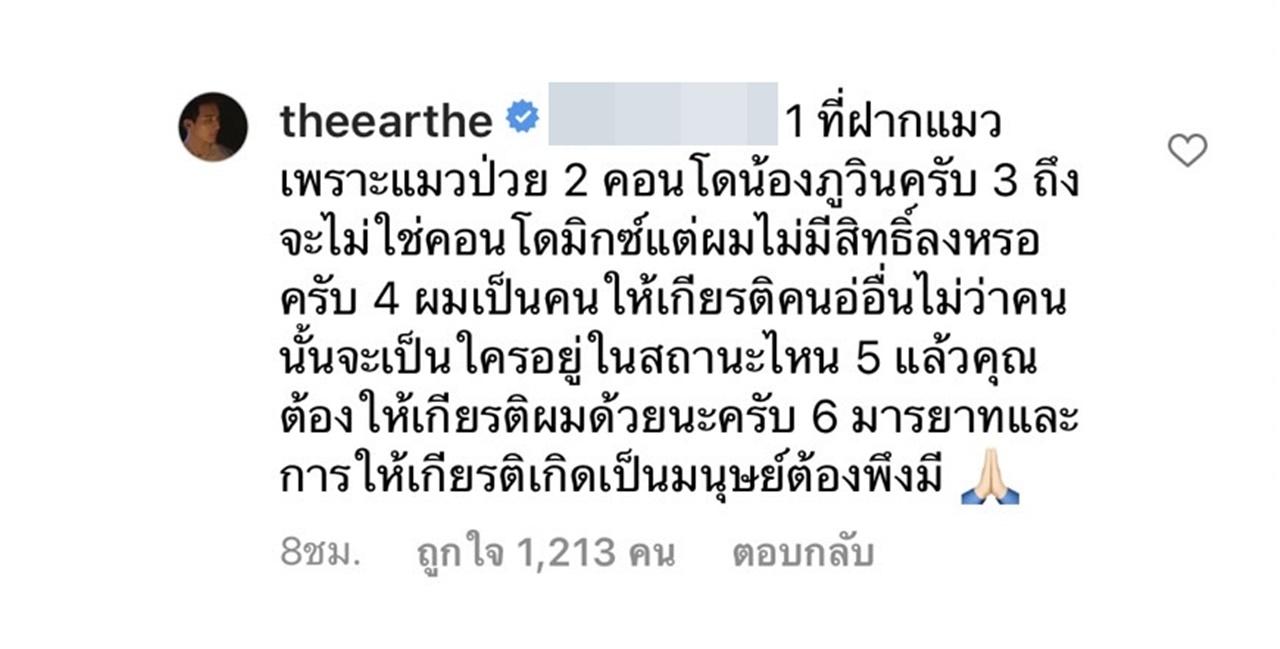 เพราะเหตุนี้ เอิร์ท พิรพัฒน์ เลยต้องคอมเมนต์ชี้แจงชาวเน็ตคนดังกล่าวก่อนทิ้งท้ายด้วยประโยคเด็ดสุดจี๊ดว่า "1 ที่ฝากแมวเพราะแมวป่วย 2 คอนโดน้องภูวินครับ 3 ถึงจะไม่ใช่คอนโดมิกซ์ แต่ผมไม่มีสิทธิ์ลงเหรอครับ