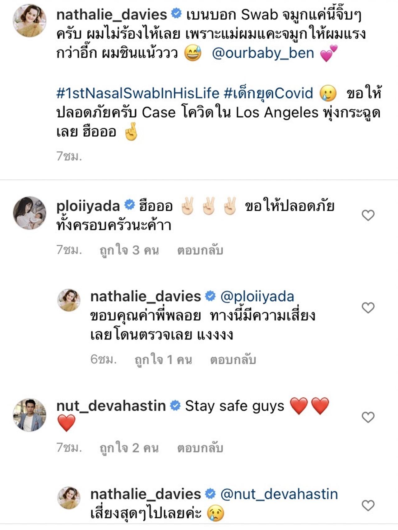 เพื่อนและแฟนคลับน้องเบนหลายคนที่ติดตามต่างเข้ามาอวยพรให้ นาตาลี และครอบครัวปลอดภัยจากโรคระบาดในครั้งนี้.