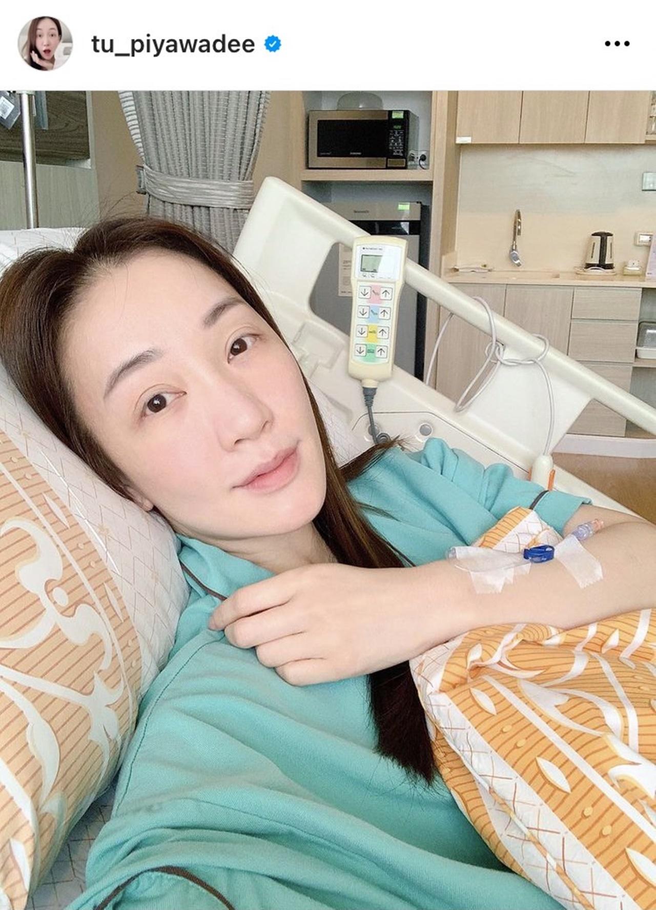 จากนั้นไม่นาน เจ้าตัวก็ได้โพสต์ภาพที่นั่งอยู่บนเตียงคนไข้อีกครั้ง พร้อมเผยให้เห็นรอยเข็มสายน้ำเกลือ พร้อมบอกว่า ต้องกลับมาโรงพยาบาลอีกรอบ หลังออกไปได้ไม่เกินชั่วโมง เพราะปวดท้องจนหมดสติ และหมอตรวจพบแบคทีเรียลงกระเพาะ