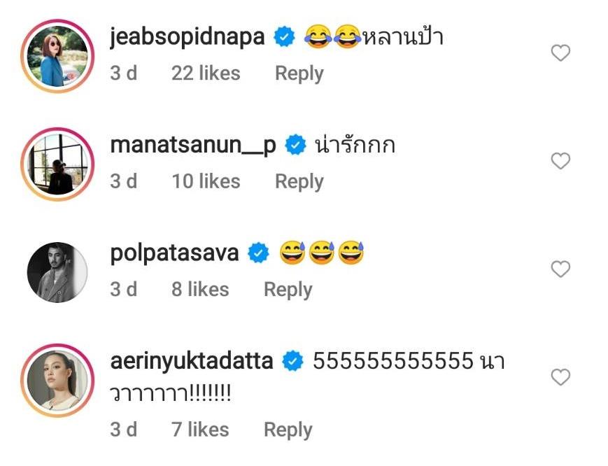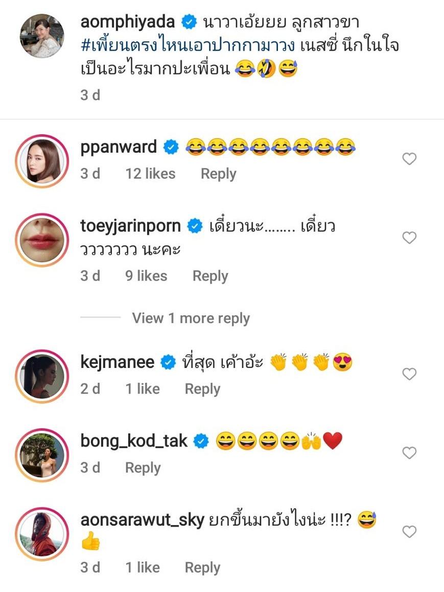ท่ามกลางคอมเมนต์แซวจากคนในวงการบันเทิง อาทิ เต้ย จรินทร์พร “เดี๋ยวนะ…….. เดี๋ยวววววววว นะคะ”, เป้ย ปานวาด ส่งอีโมจิขำน้ำตาไหล, ปิ่น เก็จมณี “ที่สุด เค้าอะ”, อ้น สราวุธ “ยกขึ้นมายังไงน่ะ !!!?”, เจี๊ยบ โสภิตนภา “หลานป้า” ฯลฯ