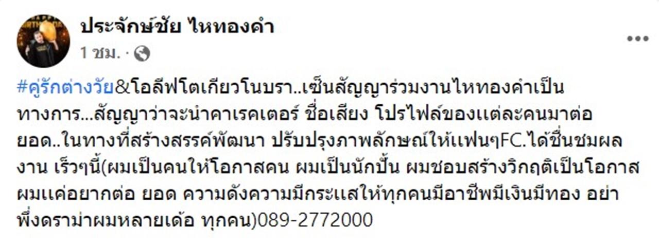 จากนั้นก็ได้เผยต่อว่า ตนเองกำลังพา พี่พร น้องเวฟ คู่รักต่างวัย พร้อมด้วย น้องโอลีฟ แม่ค้าขายโตเกียวโนบรา ที่โด่งดังในโซเชียล ไปเซ็นสัญญาเป็นศิลปินในสังกัด ไหทองคำ พร้อมบอกด้วยว่า จะนำคาแรกเตอร์ของแต่ละคนมาปั้นให้มีชื่อเสียงให้ได้ และทิ้งท้ายว่า ไม่อยากให้ดราม่ากัน