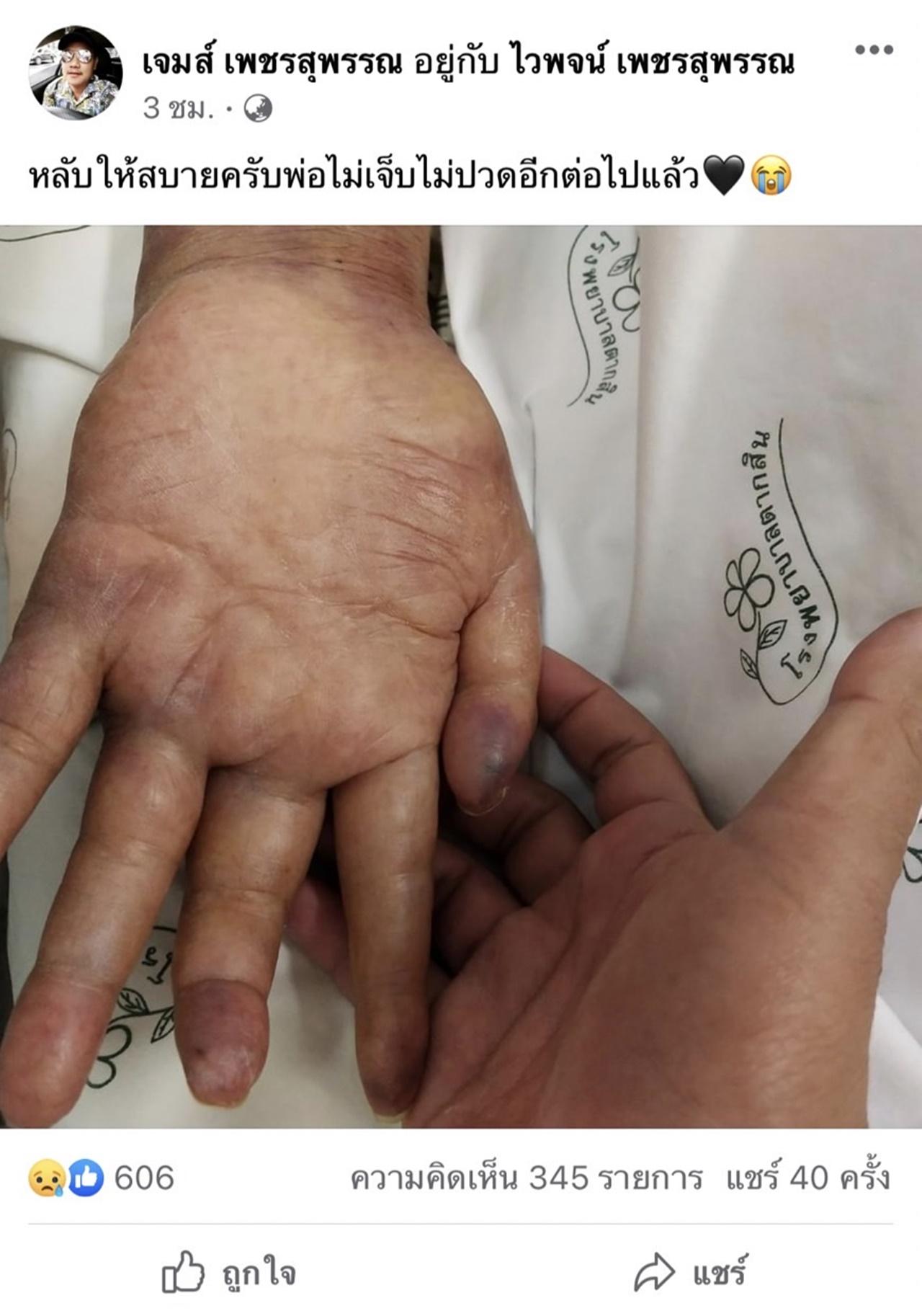 ล่าสุด ลูกชายของ ไวพจน์ เพชรสุพรรณ ได้โพสต์รูปจับมือของพ่อเป็นครั้งสุดท้าย พร้อมกับเขียนข้อความสุดเศร้าผ่านทางเฟซบุ๊กที่ใช้ชื่อว่า เจมส์ เพชรสุพรรณ เอาไว้ว่า "หลับให้สบายครับพ่อไม่เจ็บไม่ปวดอีกต่อไปแล้ว"