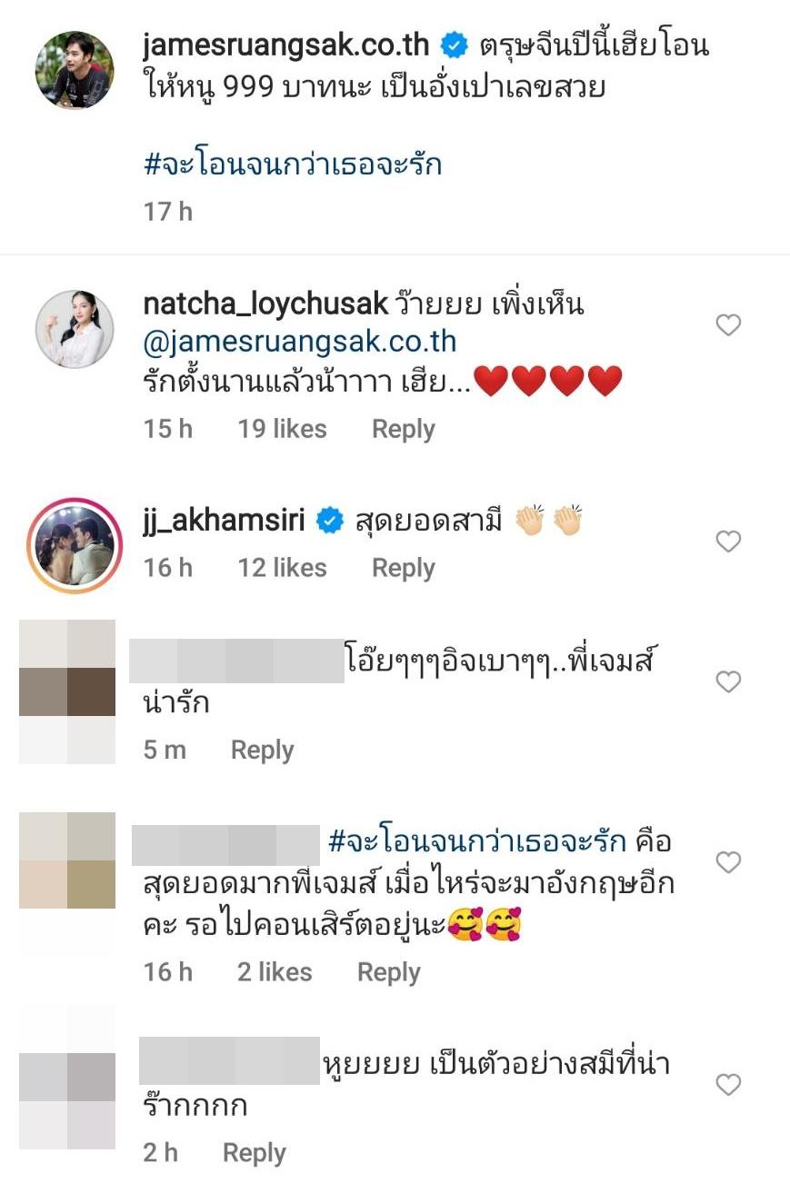 ด้านครูก้อย นัชชา พอเห็นสลิปโอนเงินแล้วทำเอาเจ้าตัวเซอร์ไพรส์ คอมเมนต์ตอบกลับสุดหวานว่า “ว๊ายยย เพิ่งเห็น @jamesruangsak.co.th รักตั้งนานแล้วน้าาาา เฮีย...” ส่วนคนในวงการบันเทิงอย่างนางเอกสาว จั๊กจั่น อคัมย์สิริ ก็แสดงความคิดเห็นว่า “สุดยอดสามี” รวมไปถึงแฟนๆ ที่ต่างคอมเมนต์แซว อาทิ สามีแห่งชาติ, เป็นอีก 1 วิธีบอกเมียว่ารักไม่มีเสื่อมคลาย, สายเปย์ ชอบๆๆๆ, พี่เจมส์ควรจัดตั้งศูนย์ฝึกอบรมสามีค่ะ ฯลฯ