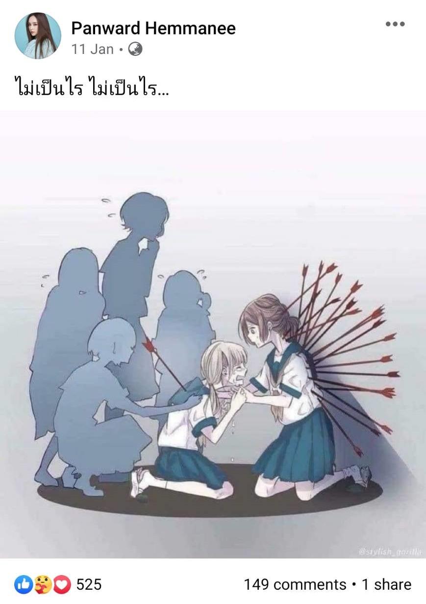 ล่าสุด 11 ม.ค. 2565 ในเฟซบุ๊กส่วนตัวของเป้ย ปานวาด มีการโพสต์ภาพเด็กนักเรียนหญิง 2 คน คนหนึ่งมีธนูปักหลัง 1 อัน ร้องไห้มากมายแต่มีคนอื่นคอยปลอบใจ แต่อีกคนมีธนูปักหลังมากมายจนสาหัสแต่กลับไม่มีคนปลอบใจอยู่ใกล้ๆ พร้อมทั้งเขียนแคปชั่น “ไม่เป็นไร ไม่เป็นไร...” โดยมีแฟนๆ เข้ามาคอมเมนต์ให้กำลังใจเป็นจำนวนมาก พร้อมทั้งบอกว่าจะอยู่เคียงข้างเป้ยเสมอ และส่งอีโมจิหัวใจให้.