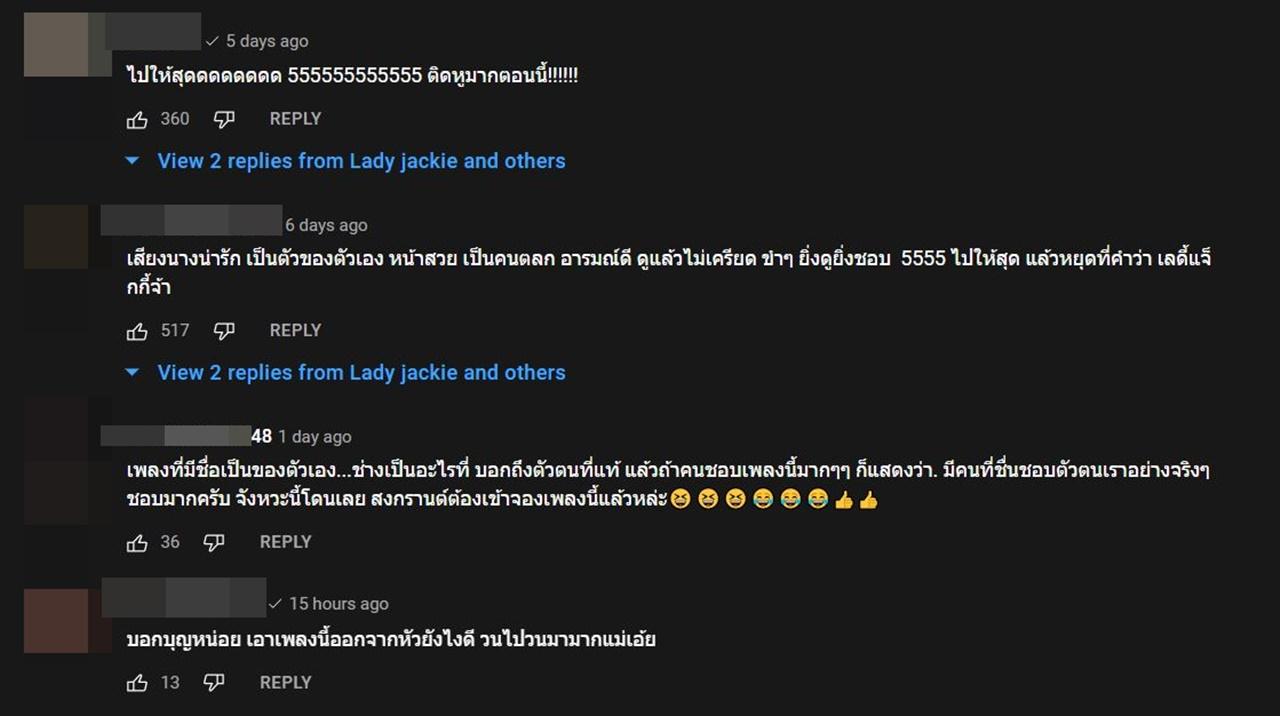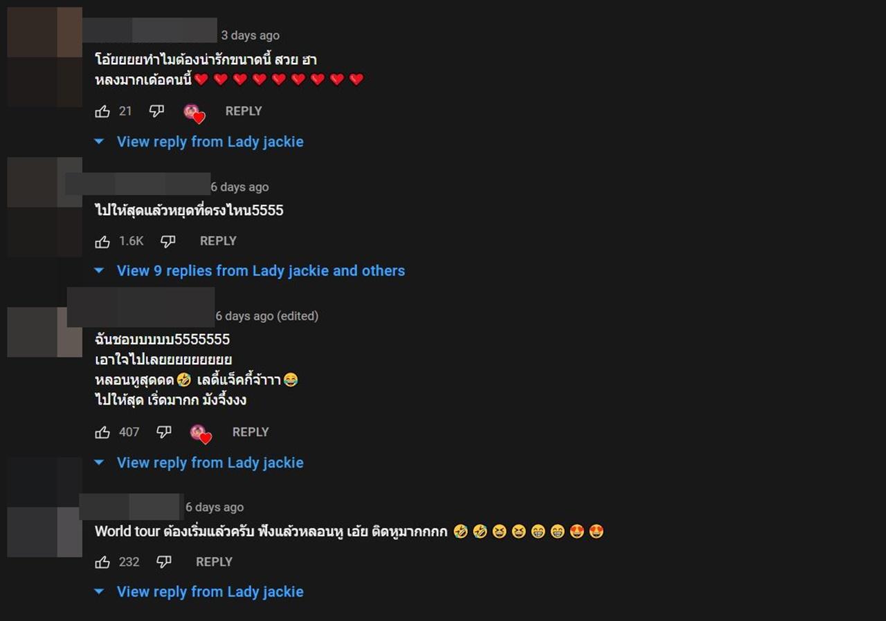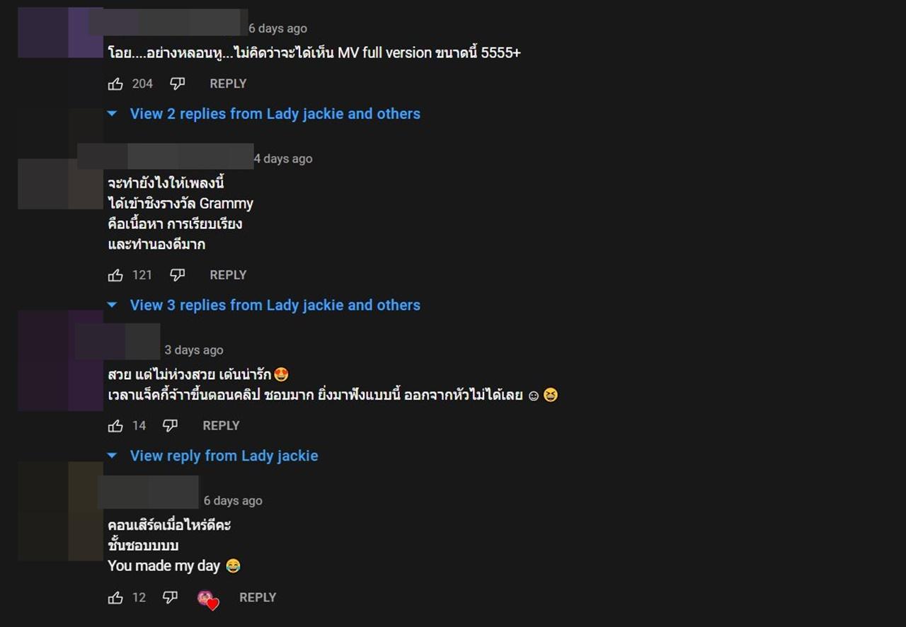 และหลังจากที่แฟนๆ ของสาวแจ็คกี้ได้ฟังเพลงและชมเอ็มวีก็ต่างเข้ามาคอมเมนต์แสดงความคิดเห็นอย่างถล่มทลายเอาไว้ว่า "ไปให้สุดดดดดดดด 555555555555 ติดหูมากตอนนี้!!!!!!, ชอบมากครับ จังหวะนี้โดนเลย สงกรานต์ต้องเข้าจองเพลงนี้แล้วหล่ะ, บอกบุญหน่อย เอาเพลงนี้ออกจากหัวยังไงดี วนไปวนมามากแม่เอ้ย, หลอนหูสุดดด เลดี้แจ็คกี้จ้าาา, ฟังแล้วหลอนหู เอ้ย ติดหูมากกกก, โอย....อย่างหลอนหู...ไม่คิดว่าจะได้เห็น MV full version ขนาดนี้"