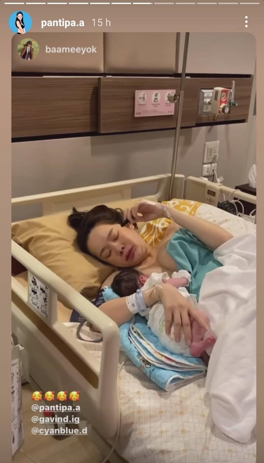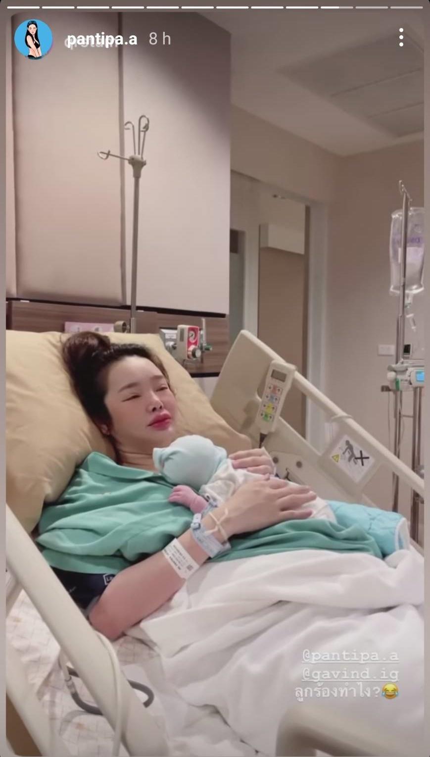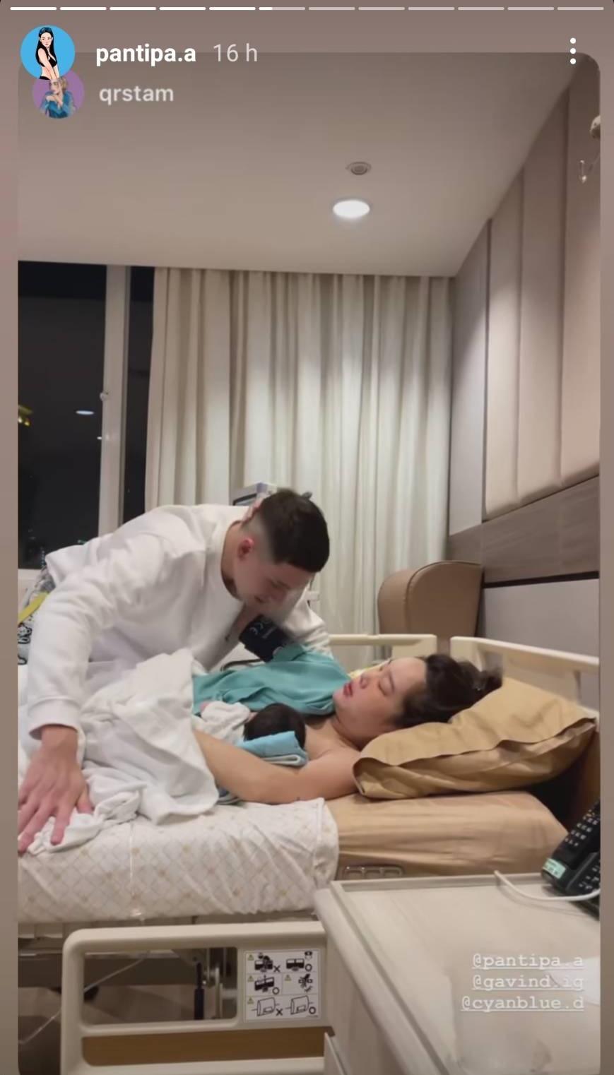 ด้าน ปุ้มปุ้ย พรรณทิพา รีโพสต์ภาพและคลิปของผู้จัดการส่วนตัวเช่นกัน ก่อนจะโพสต์ภาพโมเมนต์แรกพร้อมหน้าพ่อแม่ลูกในห้องคลอด รวมถึงภาพตอนที่ปุ้มปุ้ยเอาลูกชายมาแนบไว้กับอก โดยมีกวินท์คอยดูแลอยู่ไม่ห่าง พร้อมทั้งเขียนแคปชั่น “You + me = three 38 + 3 weeks 16/1/2022 15:15 pm”