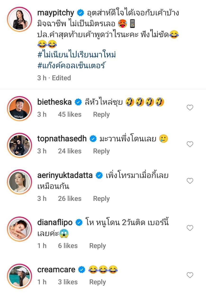 ทำเอาแฟนๆ ต่างเข้ามาคอมเมนต์แชร์ประสบการณ์รัวๆ บอกว่าเพิ่งโดนเหมือนกัน เบอร์เดียวกันเลย บ้างก็บอกว่าได้ยินคำด่าของแก๊งคอลเซ็นเตอร์ด้วย แรงมาก ด้านคนในวงการบันเทิงก็เข้ามาคอมเมนต์ อาทิ ท็อป ณัฐเศรษฐ์ “มะวานพึ่งโดนเลย”, ครีม เปรมสินี ส่งอีโมจิขำน้ำตาไหล, แอริน ยุกตะทัต “เพิ่งโทรมาเมื่อกี้เลยเหมือนกัน”, บี้ เดอะสกา “ลีหัวไหล่ซุย” ฯลฯ.
