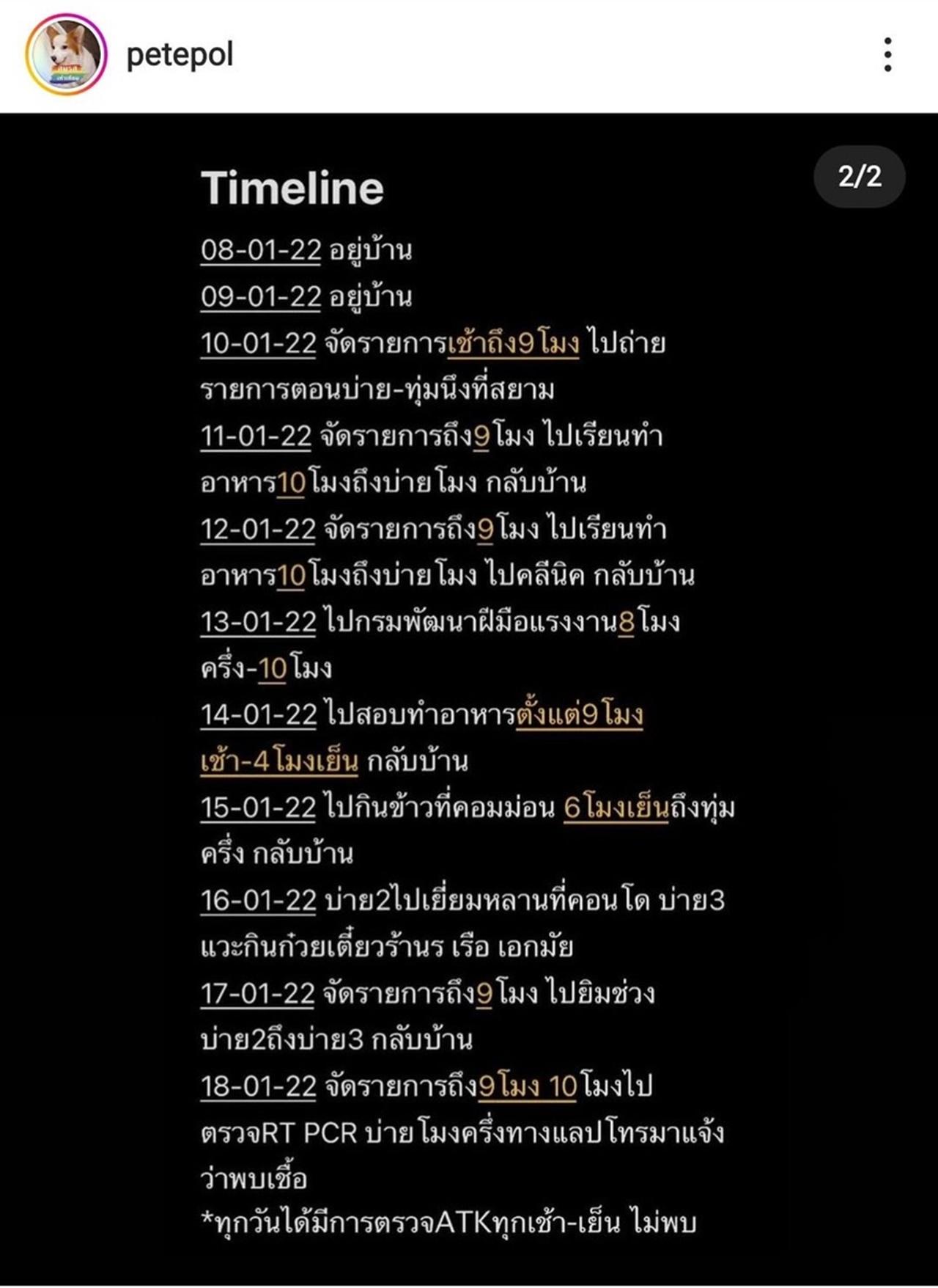 “เมื่อช่วงสายได้ไปทำการตรวจหาเชื้อโควิด19 มา ทราบผลตอนช่วงบ่าย สรุปว่าพบเชื้อนะครับ ต้องขออภัยทุกท่านที่ติดต่องานไว้แล้วด้วยนะครับ” และนักร้องหนุ่มเสียงดีก็ได้แจ้งไทม์ไลน์ ดังนี้