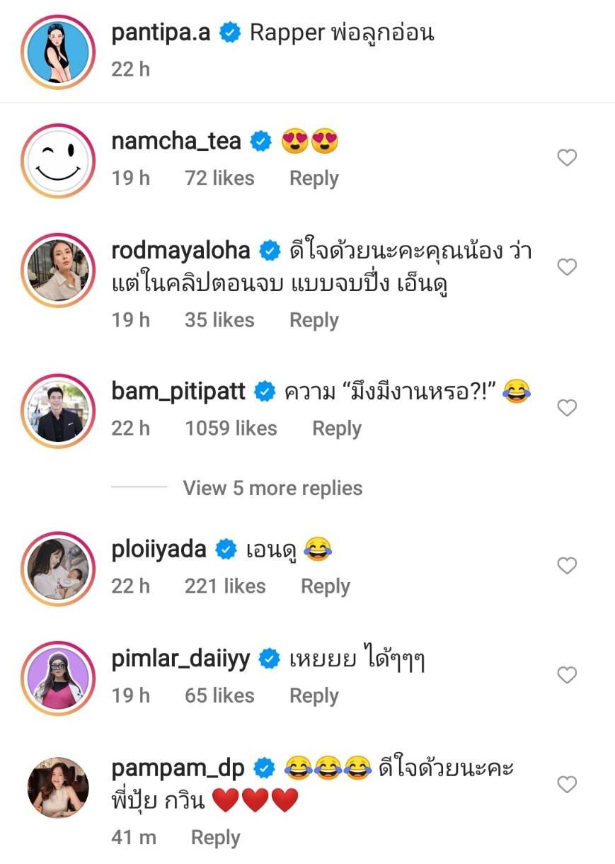 งานนี้ทำเอาแฟนๆ ต่างคอมเมนต์ฮาหนักมาก ทั้งยินดีและบอกว่าชอบตอนจบของคลิป รวมไปถึงเพื่อนๆ ในวงการที่เข้ามาแซว อาทิ แบม ปิติภัทร “ความ “มึงมีงานหรอ?!”” รถเมล์ คะนึงนิจ “ดีใจด้วยนะคะคุณน้อง ว่าแต่ในคลิปตอนจบ แบบจบปึ่ง เอ็นดู”, พลอย อัยดา “เอ็นดู”, สอดอ Style “เหยยย ได้ๆๆๆ” ฯลฯ