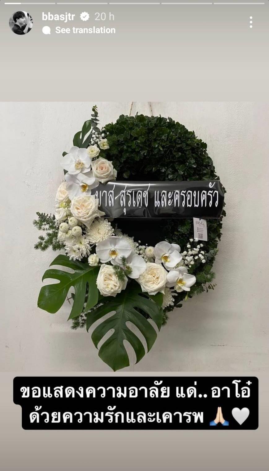ซึ่งบาสก็ได้โพสต์ภาพพวงหรีดที่ส่งไปลงในไอจีสตอรี่ พร้อมทั้งเขียนข้อความว่า “ขอแสดงความอาลัย แด่...อาโอ๋ ด้วยความรักและเคารพ” พร้อมทั้งใส่อีโมจิพนมมือและหัวใจสีขาว.