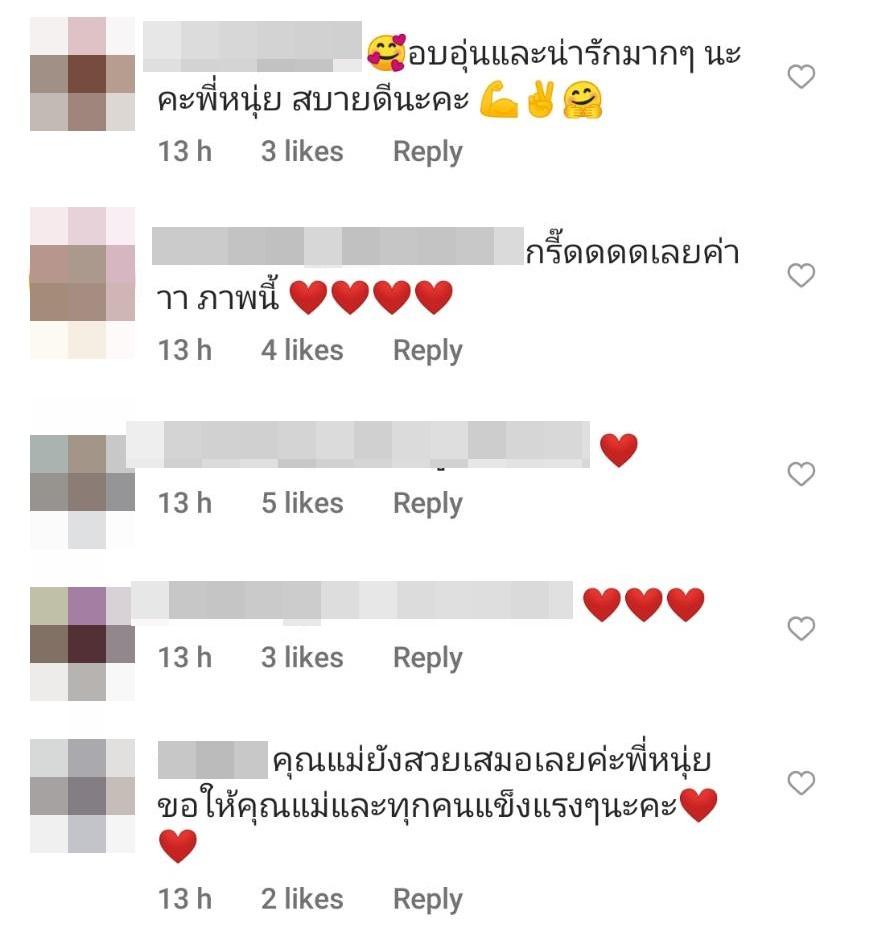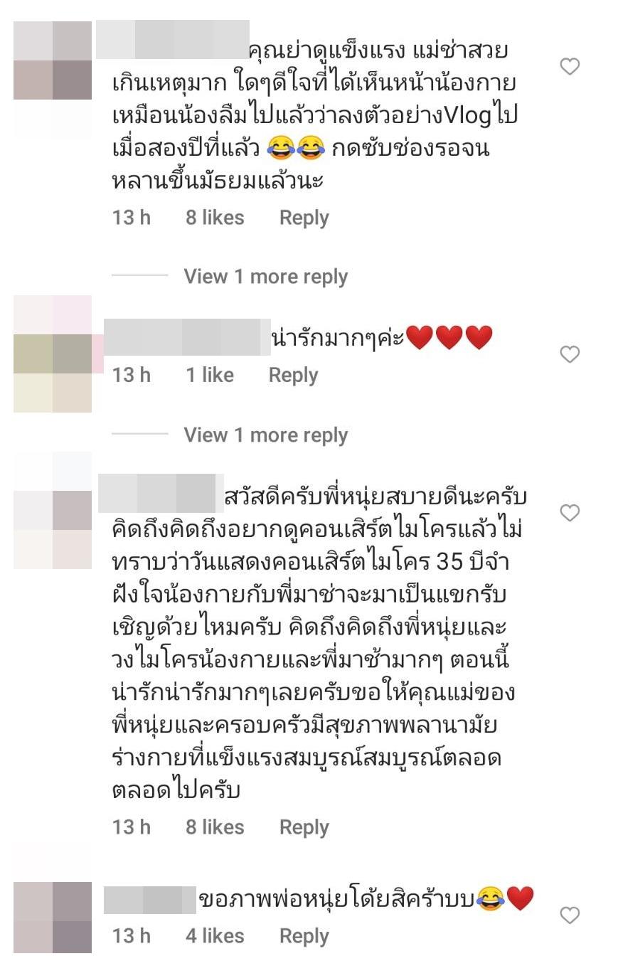 ท่ามกลางคอมเมนต์จากแฟนๆ ที่ต่างชื่นชมนับร้อยข้อความ อาทิ อบอุ่นและน่ารักมากๆ นะคะพี่หนุ่ย สบายดีนะคะ, กรี๊ดดดดเลยค่าาา ภาพนี้, คุณแม่ยังสวยเสมอเลยค่ะพี่หนุ่ย ขอให้คุณแม่และทุกคนแข็งแรงๆนะคะ, ขอภาพพ่อหนุ่ยโด้ยสิคร้าบบ, คุณย่าดูแข็งแรง แม่ช่าสวยเกินเหตุมาก ใดๆ ดีใจที่ได้เห็นหน้าน้องกาย เหมือนน้องลืมไปแล้วว่าลงตัวอย่าง Vlog ไปเมื่อสองปีที่แล้ว กดซับช่องรอจนหลานขึ้นมัธยมแล้วนะ ฯลฯ