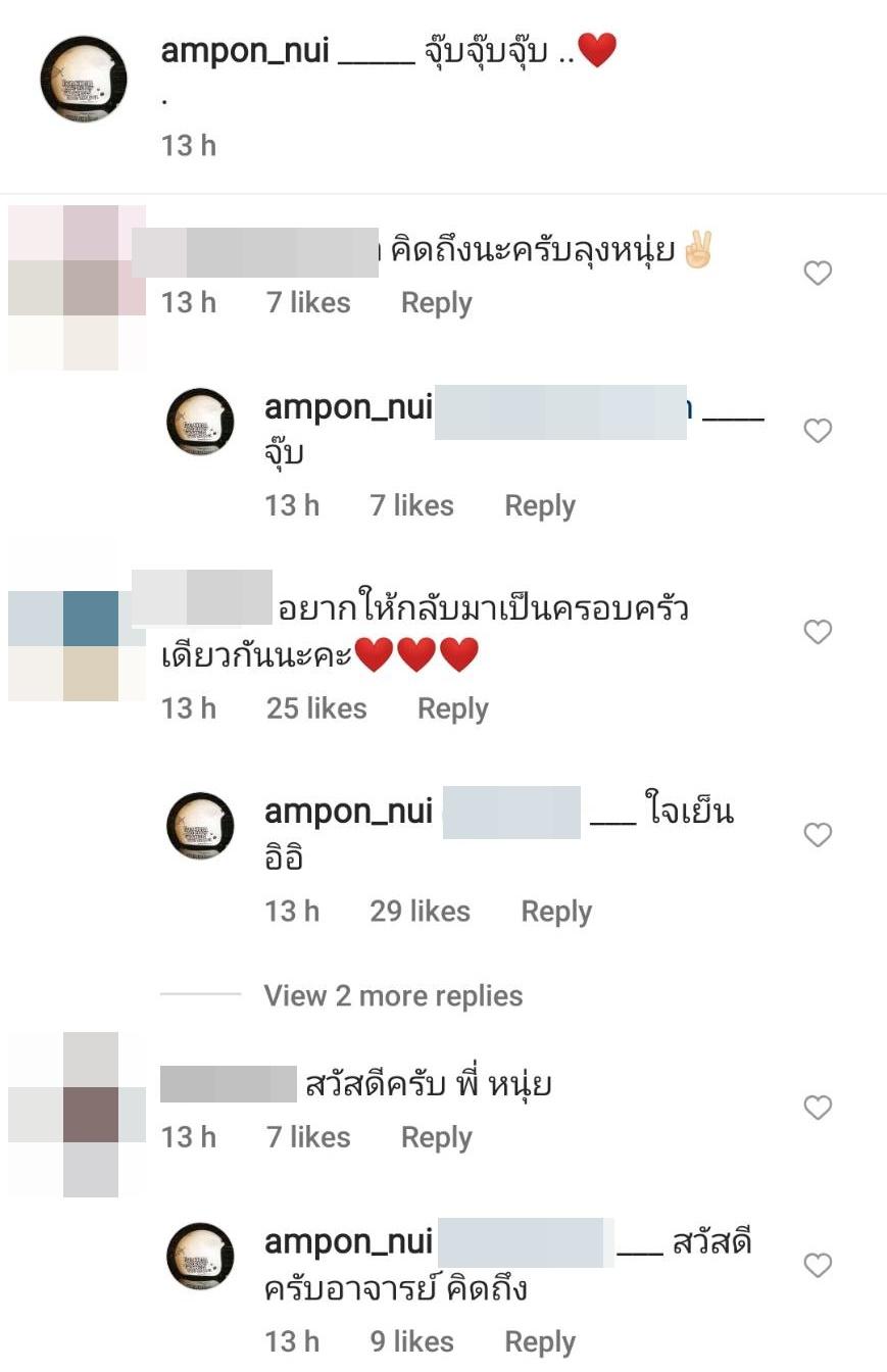 นอกจากนี้ยังมีแฟนคลับรายหนึ่งที่เข้ามาคอมเมนต์เชียร์ให้ทั้งคู่คืนดีกัน โดยบอกว่า “อยากให้กลับมาเป็นครอบครัวเดียวกันนะคะ” ก่อนที่หนุ่ยจะตอบกลับไปว่า “ใจเย็น อิอิ”.
