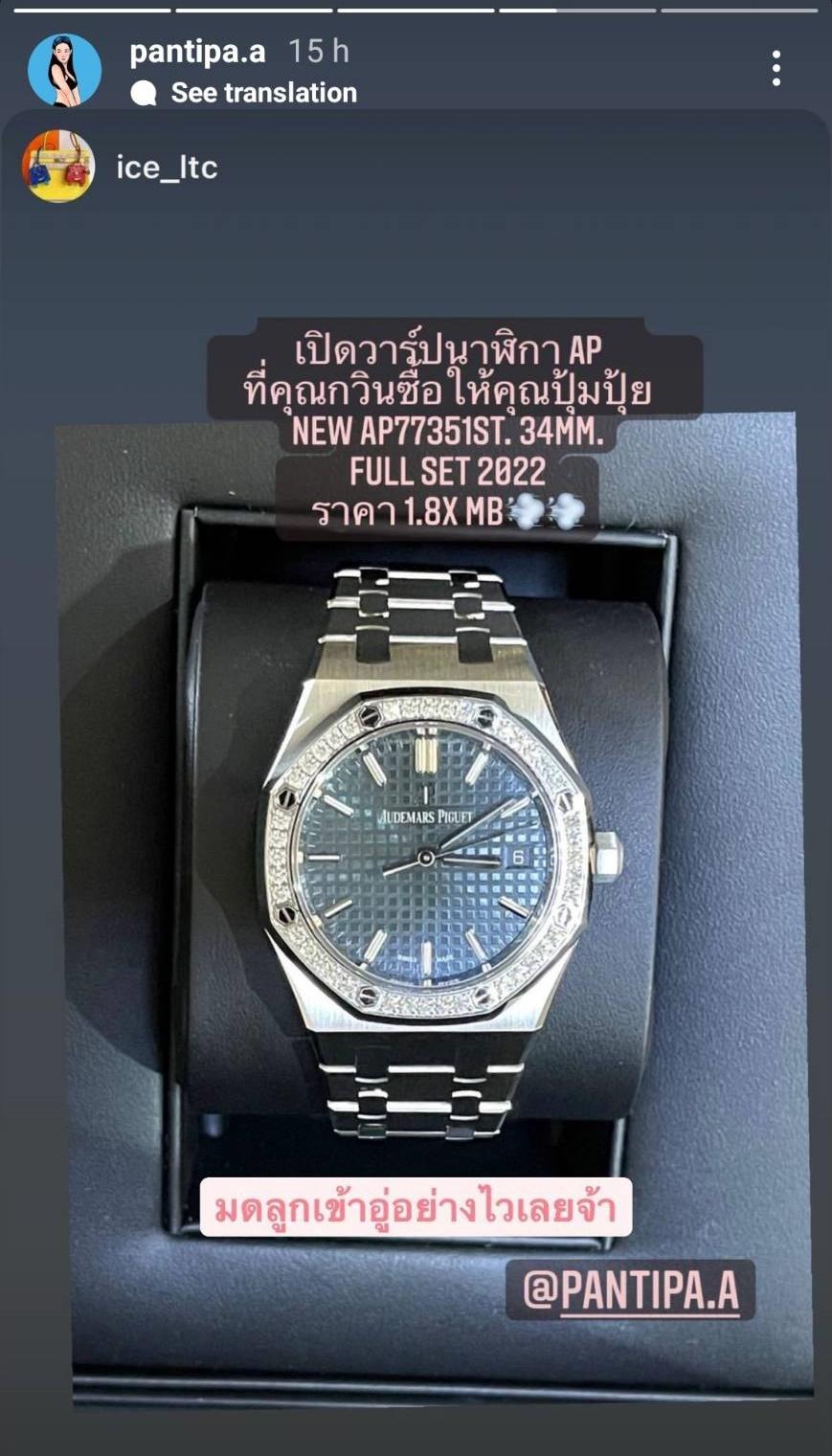 หลังจากนั้น ปุ้มปุ้ย พรรณทิพา ได้รีโพสต์ภาพเปิดวาร์ปข้อมูลนาฬิกาที่กวินท์ซื้อให้ปุ้มปุ้ย งานนี้เลยได้เห็นความสวยอลังการของนาฬิกาแบบเต็มๆ ซึ่งในภาพดังกล่าวเขียนข้อความไว้ว่า “เปิดวาร์ปนาฬิกา AP ที่คุณกวินท์ ซื้อให้คุณปุ้มปุ้ย NEW AP77351ST. 34MM. FULL SET 2022 ราคา 1.8X MB” และปุ้มปุ้ยก็ใส่แคปชั่นสุดฮาไว้ว่า “มดลูกเข้าอู่อย่างไวเลยจ้า”.
