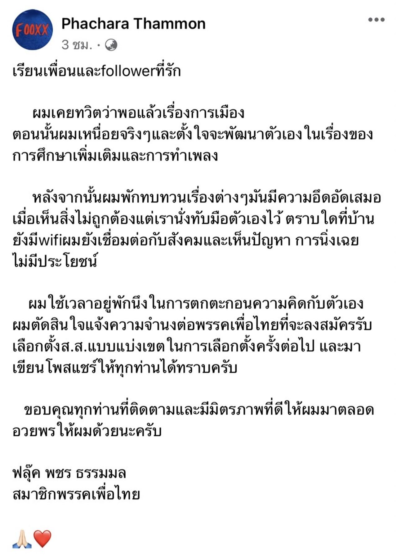 ขอบคุณทุกท่านที่ติดตามและมีมิตรภาพที่ดีให้ผมมาตลอด อวยพรให้ผมด้วยนะครับ ฟลุ๊ค พชร ธรรมมล สมาชิกพรรคเพื่อไทย".