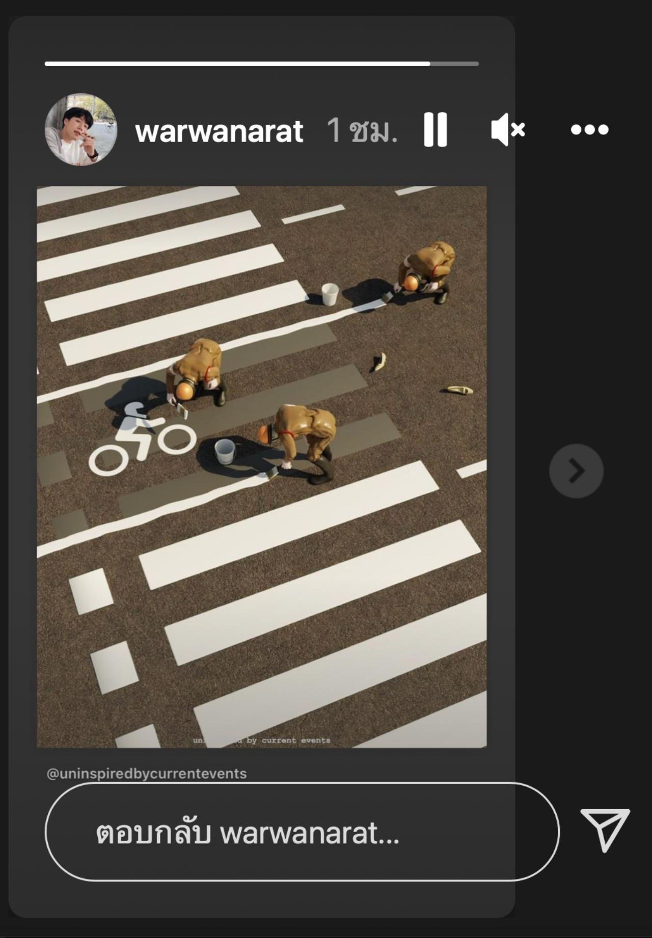 พระเอกหล่อขาวใส วอร์ วนรัตน์ รัศมีรัตน์ ก็โพสต์ไอจีสตอรี่ เป็นภาพตำรวจ 3 คน กำลังตีเส้นให้รถมอเตอร์ไซค์ ทับทางม้าลาย ซึ่งใครเห็นก็ตีความได้ไม่ยากว่าต้องการสื่ออะไร