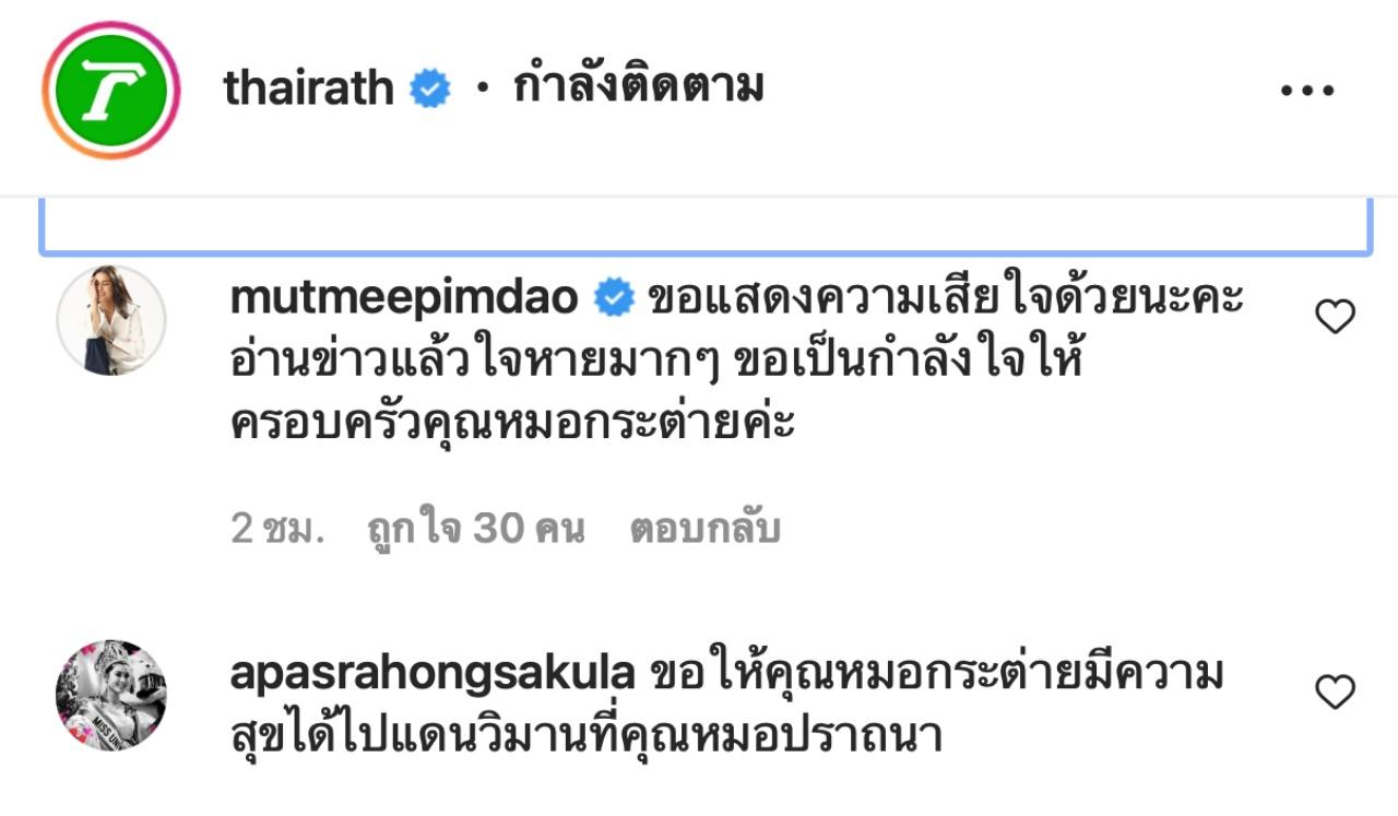 ส่วนสองดาวดัง ก็เมนต์ร่วมแสดงความเสียใจ กับหมอกระต่ายไปแล้ว ที่ไอจี ไทยรัฐออนไลน์ มัดหมี่ พิมดาว พานิชสมัย "ขอแสดงความเสียใจด้วยนะคะ อ่านข่าวแล้วใจหายมากๆ ขอเป็นกำลังใจให้ครอบครัวคุณหมอกระต่ายค่ะ"