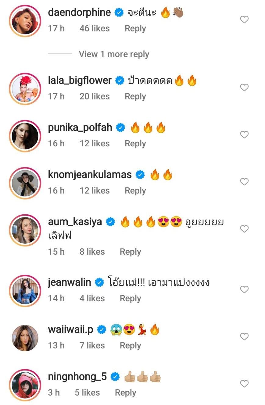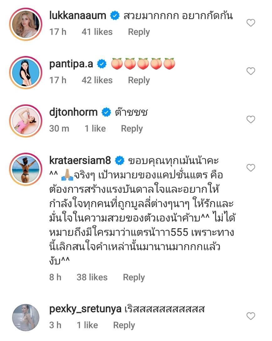 หลังจากนั้นก็มีทั้งสาวๆ ในวงการบันเทิง รวมถึงแฟนๆ เข้ามาแสดงความคิดเห็นหลายร้อยข้อความ ซึ่งกระแตก็ได้คอมเมนต์เพิ่มเติมใต้ภาพไว้ว่า “ขอบคุณทุกเม้นน้าคะ ^^ จริงๆ เป้าหมายของแคปชั่นแตร คือ ต้องการสร้างแรงบันดาลใจและอยากให้กำลังใจทุกคนที่ถูกบูลลี่ต่างๆ นาๆ ให้รักและมั่นใจในความสวยของตัวเองน้าค้าบ^^ ไม่ได้หมายถึงมีใครมาว่าแตรน้าาา 555 เพราะทางนี้เลิกสนใจคำเหล่านั้นมานานมากกกแล้วงับ^^”.