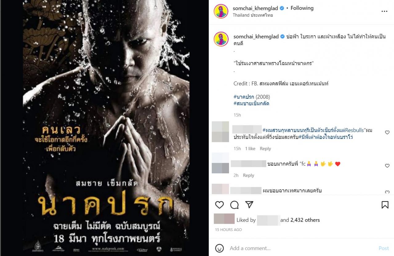 ล่าสุด เต๋า สมชาย ก็ได้โพสต์ภาพโปสเตอร์ภาพยนตร์ดังกล่าว ซึ่งมีข้อความที่เขียนว่า “คนเลว จะใช้โอกาสอีกกี่ครั้งเพื่อกลับตัว” มาพร้อมแคปชั่น “ช่อฟ้า ใบระกา และผ้าเหลือง ไม่ได้ทำให้คนเป็นคนดี "ใช้ร่มเงาศาสนาพรางโฉมหน้าฆาตกร" Credit : FB สหมงคลฟิล์ม เอนเตอร์เทนเม้นท์ #นาคปรก (2008) #สมชายเข็มกลัด”