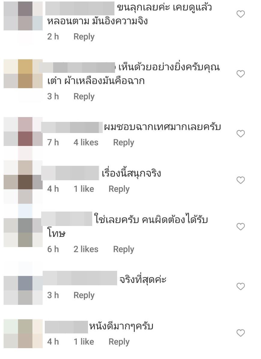 แม้แคปชั่นจะเป็นการโปรโมตภาพยนตร์ แต่ก็กลายเป็นแคปชั่นที่พีกมาก เพราะมาโพสต์ในช่วงที่กระแสดราม่าโซเชียลกำลังร้อนแรงอยู่พอดี โดยมีแฟนๆ ที่เข้ามาแสดงความคิดเห็นหลายข้อความ อาทิ ใช่เลยครับ คนผิดต้องได้รับโทษ, หนังดีมากๆ ครับ, ชัดเจนครับ, ขนลุกเลยค่ะ เคยดูแล้ว หลอนตาม มันอิงความจริง, ชอบมากกกกกกกกกก และมาถูกเวลา, เห็นด้วยอย่างยิ่งครับคุณเต๋า ผ้าเหลืองมันคือฉาก ฯลฯ