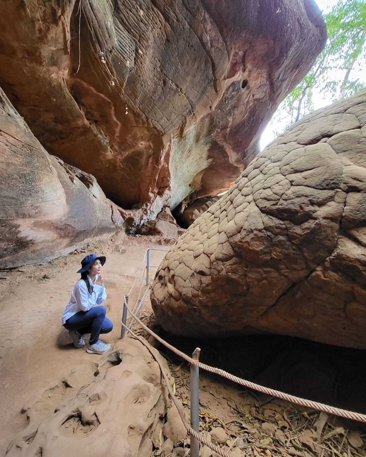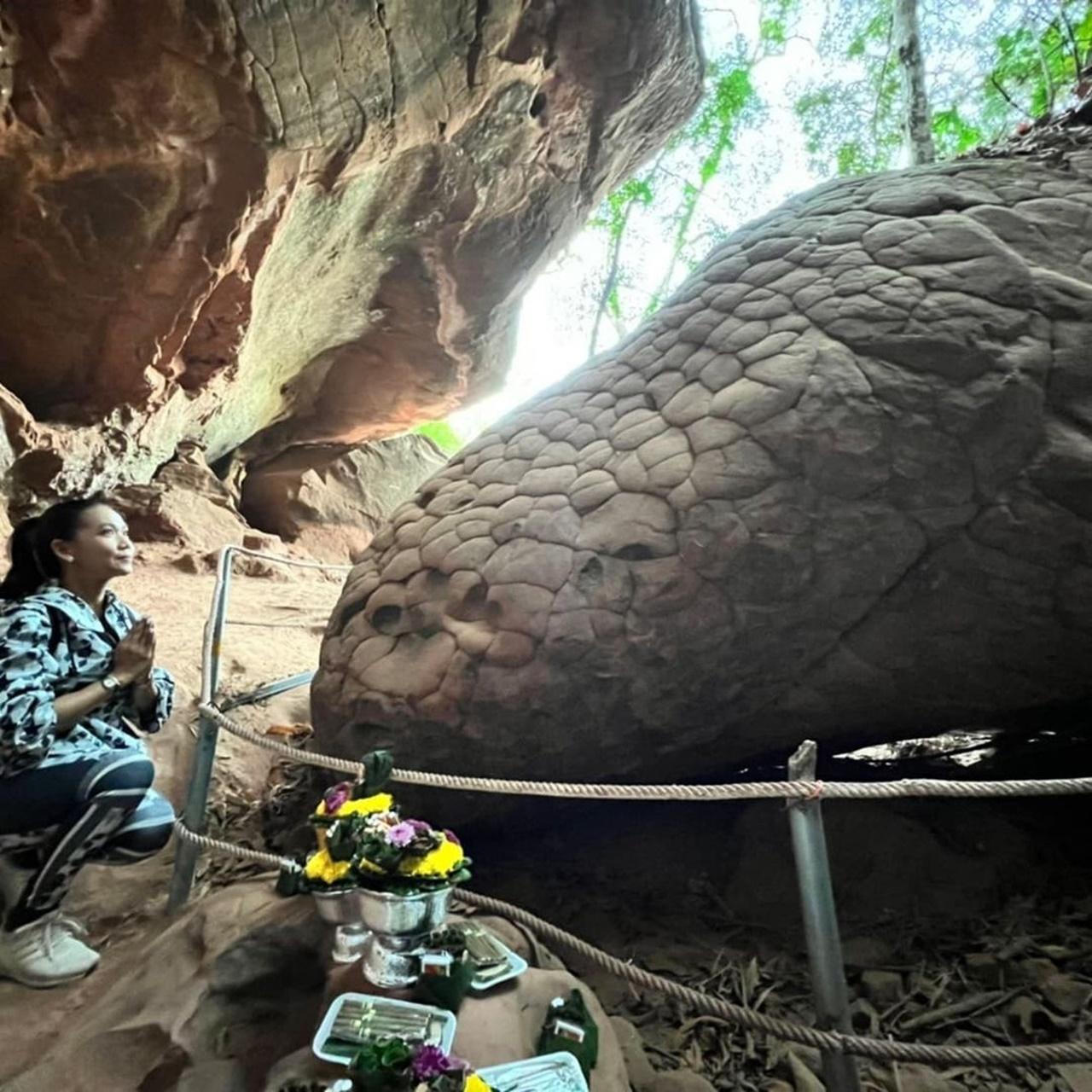 "มาค่ะ คุณเนย และคุณจั๊กจั่น สังเกตตรงหินไหมคะ มีพานดอกไม้ หมากพูล ไหมเอ่ย ไม่มีนะคะ ทั้งสองคนนี้ ปฏิบัติตามกฎ ไม่ได้แหกกฎแต่อย่างใดเลยคร้า