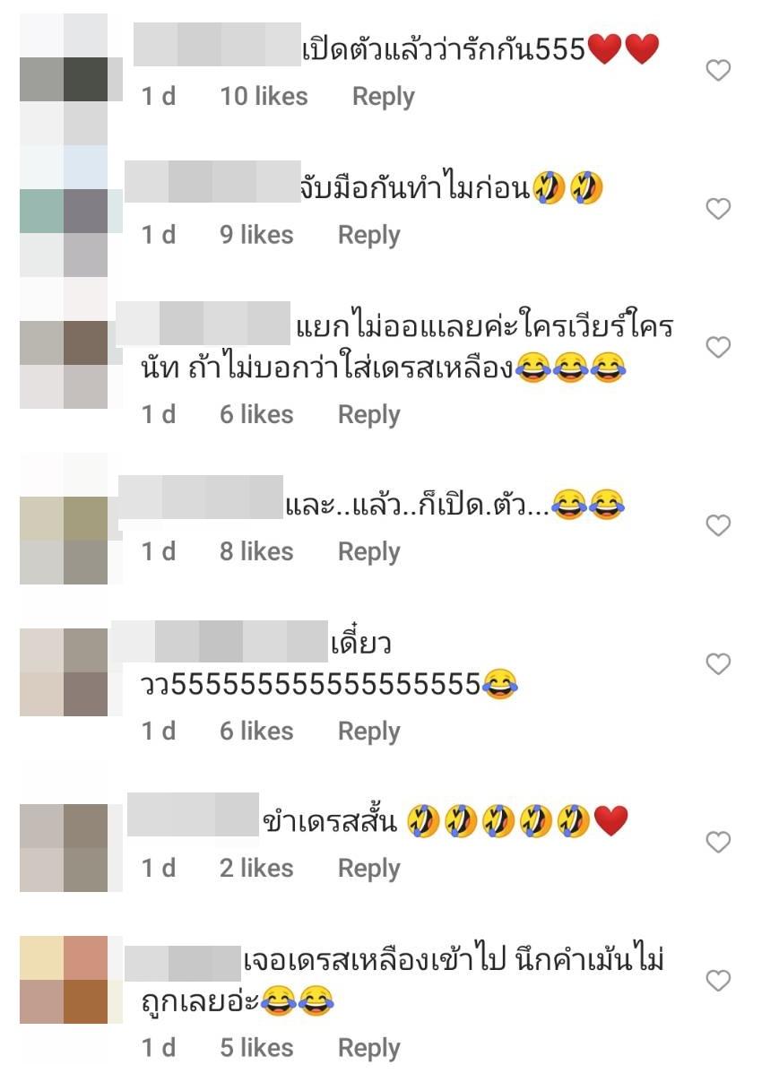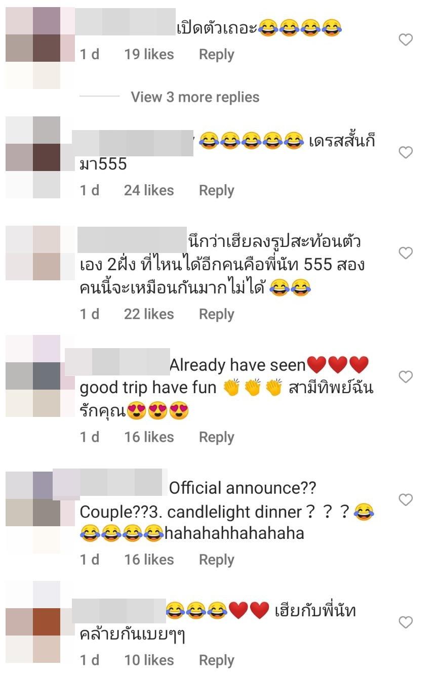 งานนี้ทำเอาแฟนๆ แห่กดไลค์พร้อมทั้งคอมเมนต์แซวรัวๆ เต็มไอจี อาทิ เปิดตัวเถอะ, เดรสสั้นก็มา555, นึกว่าเฮียลงรูปสะท้อนตัวเอง 2 ฝั่ง ที่ไหนได้อีกคนคือพี่นัท 555 สองคนนี้จะเหมือนกันมากไม่ได้, งุ้ยยยหวานเชียววว, เปิดตัวแล้วว่ารักกัน555, จับมือกันทำไมก่อน, คู่จริงอยู่นี่!!!!55555555น่าร๊ากกกกก หยอกๆ, และ..แล้ว..ก็เปิด.ตัว... ฯลฯ