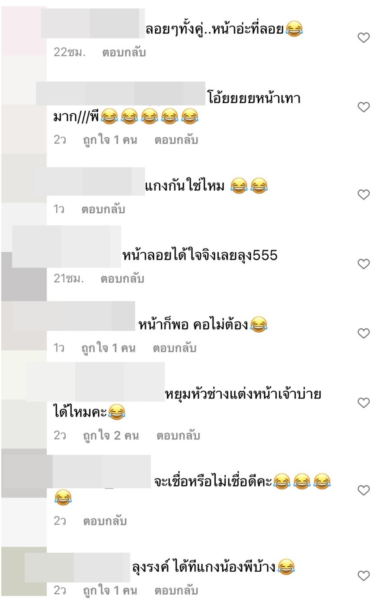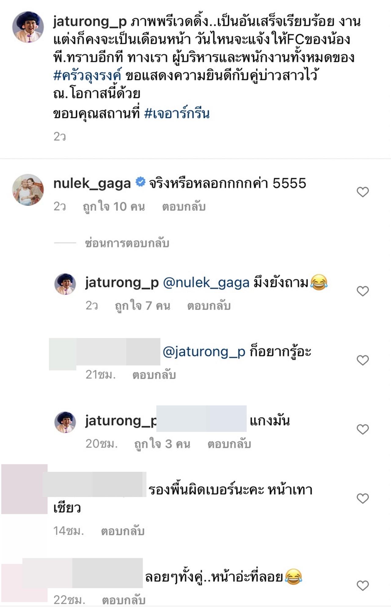 จากนั้นก็มีคนเข้ามาถามอีกว่า "ก็อยากรู้อะ" และ จตุรงค์ โพธาราม ก็ได้เข้ามาตอบคอมเมนต์ดังกล่าวอีกว่า "แกงมัน" และนอกจากนั้น ก็ยังมีชาวเน็ตเข้ามาคอมเมนต์แซวในการแต่งหน้าให้กับบ่าวสาวอีกด้วยว่า "รองพื้นผิดเบอร์นะคะ หน้าเทาเชียว, หน้าลอยได้ใจจิงเลยลุง555, ลอยๆ ทั้งคู่..หน้าอ่ะที่ลอย"