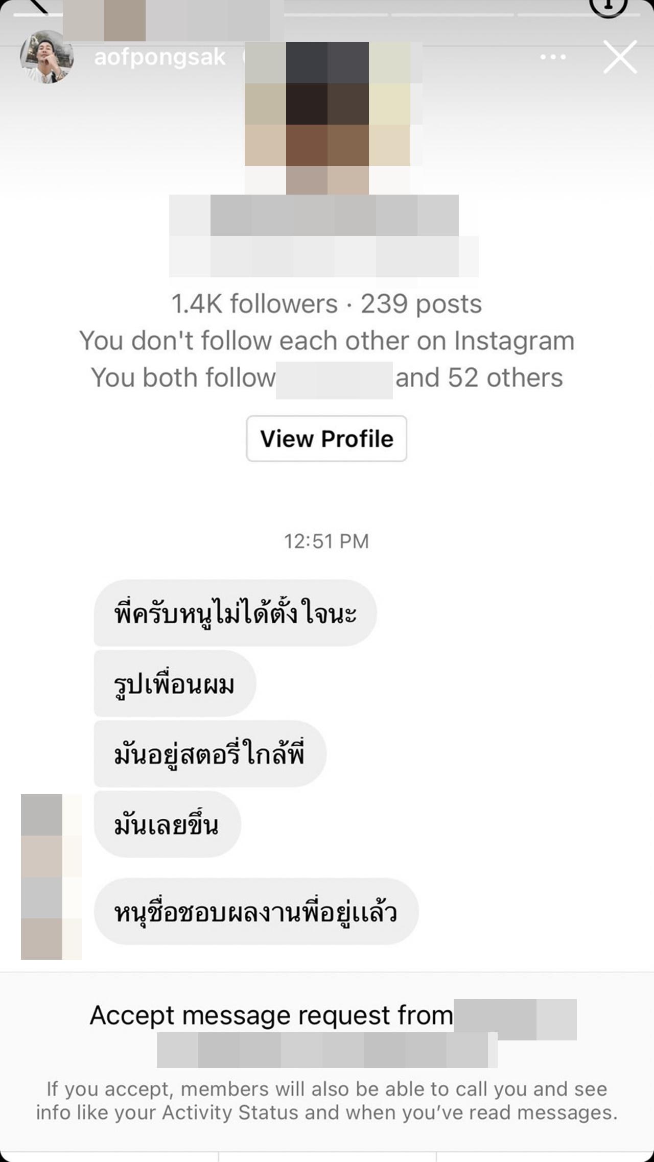 ก่อนอีกฝ่ายจะรีบทักมาหาทันทีเพื่อขอโทษ และบอกว่าไม่ได้ตั้งใจ "พี่ครับหนูไม่ได้ตั้งใจนะ รูปเพื่อนผม มันอยู่สตอรี่ใกล้พี่ มันเลยขึ้น หนูชื่นชอบผลงานพี่อยู่แล้ว".