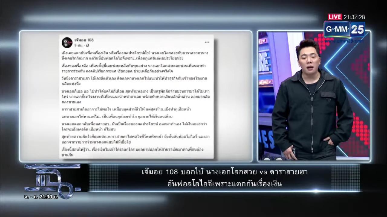 หลังจากเพจบันเทิงดัง เจ๊มอย 108 โพสต์ข่าวลือข่าวเม้าท์ถึงนางเอกโลกสวยกับดาราสายฮาแตกคอกันเพราะเรื่องผลประโยชน์ โดยเป็นฝ่ายดาราสายฮาพานางเอกไปแนะนำให้ทำธุรกิจกับเจ้าของโรงงานผลิตแห่งหนึ่ง ทำไปได้ไม่กี่เดือน สุดท้ายพอเก่งก็เทโรงงานที่เพื่อนแนะนำ หอบเงินหลักสิบล้านออกมาผลิตขายเอง ทำให้ดาราสายฮาไม่พอใจ แถมนางเอกตอบกลับเพื่อนว่าเป็นเรื่องผลประโยชน์ งานนี้ดาราสายฮาเลยอันฟอลโลว์ไอจีและลาออกจากรายการร่วมนางเอกแบบไม่มีเยื่อใย