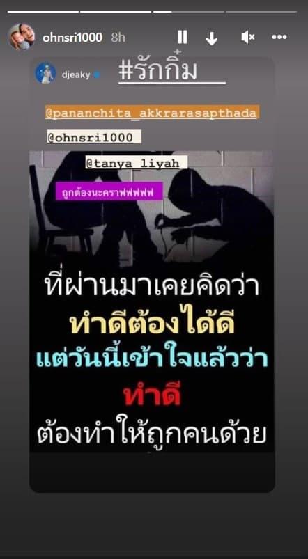 โดยหลังจากที่มดดำรายงานข่าวดังกล่าว ล่าสุด อ้น ศรีพรรณ ก็ได้รีโพสต์ภาพข้อความที่ ดีเจเอกกี้ เอกชัย เพื่อนซี้ โพสต์ในไอจีสตอรี่และแท็กหาอ้น รวมทั้งแท็กถึง ปนันชิตา เจ้าของแบรนด์ และ ธัญญ่า ธัญญาเรศ ซึ่งมีใจความว่า “ที่ผ่านมาเคยคิดว่า ทำดีต้องได้ดี แต่วันนี้เข้าใจแล้วว่า ทำดี ต้องทำให้ถูกคนด้วย” พร้อมใส่แคปชั่น “ถูกต้องนะคราฟฟฟฟฟ” ซึ่งอ้นก็ได้เขียนแคปชั่นว่า “#รักกิ๋ม” ด้วย.
