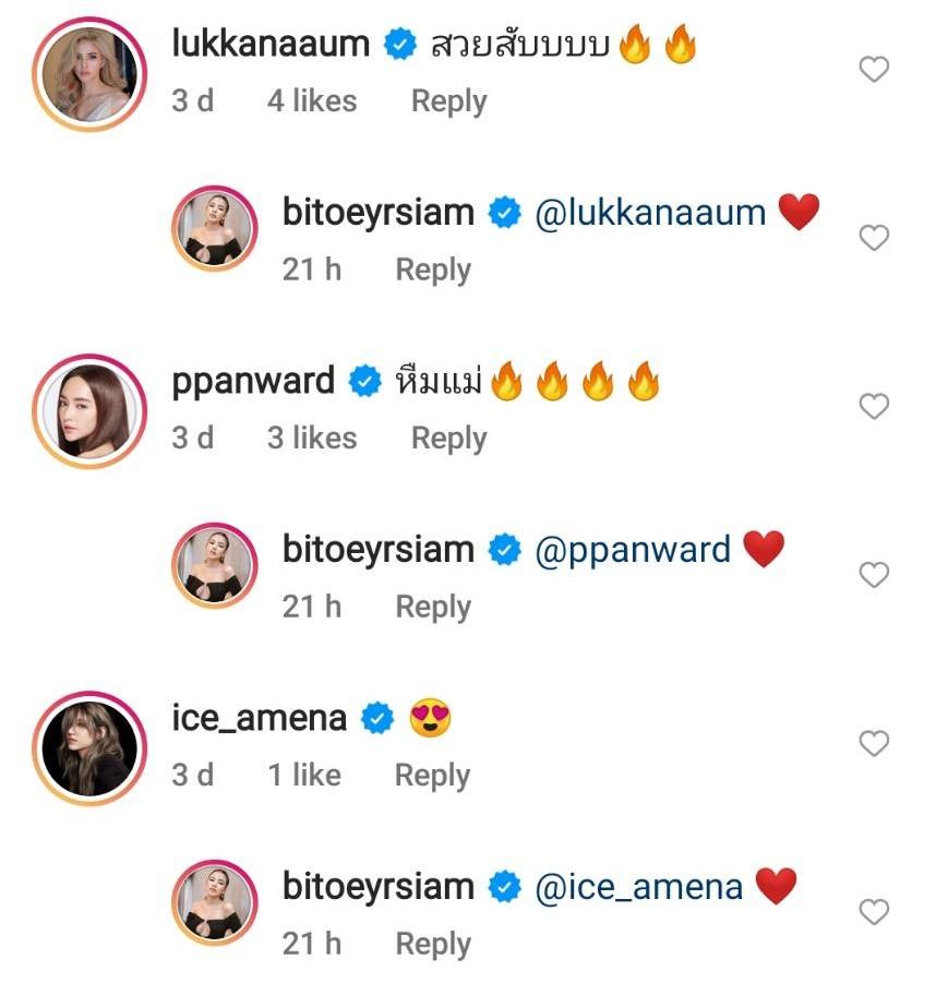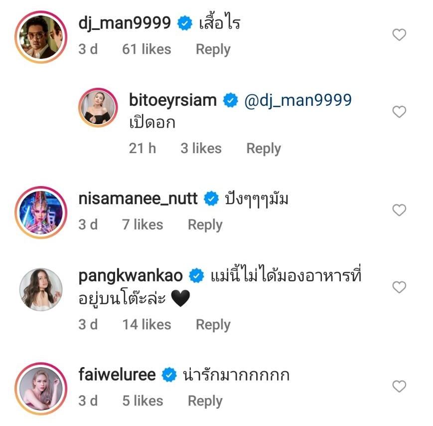 งานนี้ทำเอาคุณสามีอย่าง ดีเจแมน พัฒนพล ออกอาการหวง คอมเมนต์ถามภรรยาว่า “เสื้อไร” ก่อนที่ใบเตยจะตอบกลับว่า “เปิดอก” รวมไปถึงคนในวงการบันเทิงที่แห่แซวความแซ่บกันกระหน่ำไอจีเลยทีเดียว.