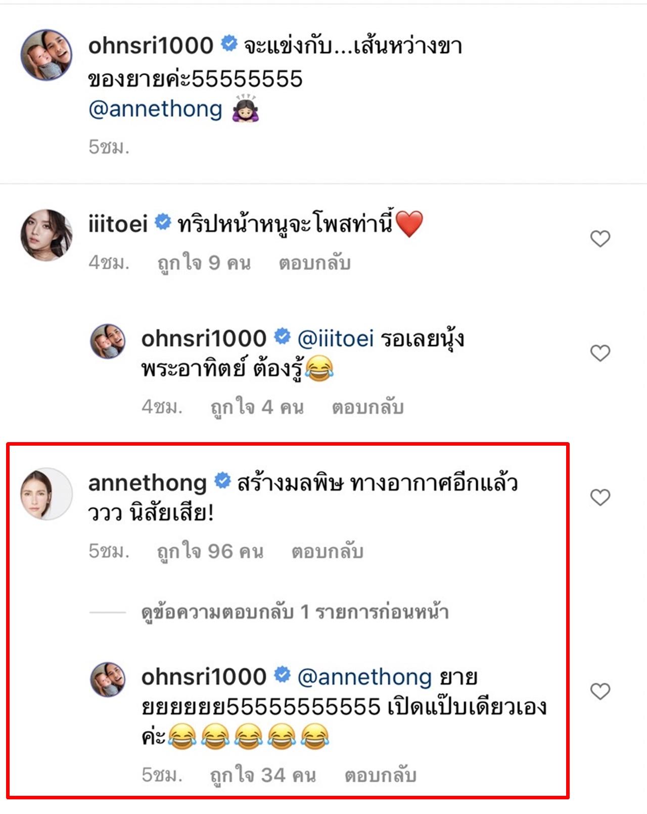 งานนี้ แอน ก็ได้เข้ามาคอนเมนต์กลับอย่างไวว่า "สร้างมลพิษ ทางอากาศอีกแล้วววว นิสัยเสีย!" หลังจากที่ อ้น ได้อ่านถึงกับหัวเราะออกมา และเขียนตอบกลับไปว่า "ยายยยยยยย55555555555 เปิดแป๊บเดียวเองค่ะ"