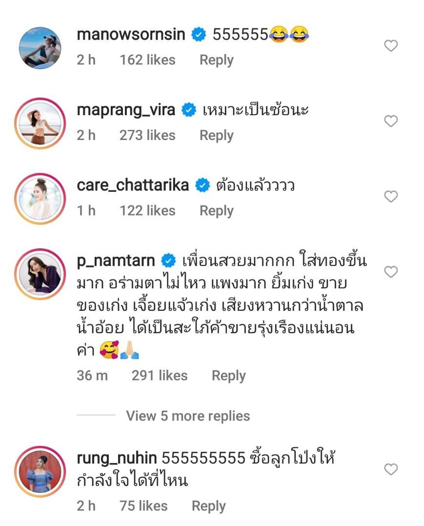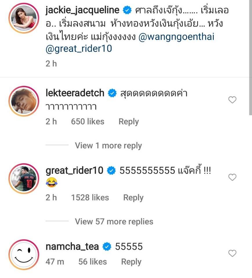 ท่ามกลางคอมเมนต์แซวจากแฟนๆ รวมถึงคนในวงการบันเทิง อาทิ อาเล็ก ธีรเดช “สุดดดดดดดดค่าาาาาาาาาาาา”, น้ำชา ชีรณัฐ “55555”, มะนาว ศรศิลป์ “555555”, มะปราง วิรากานต์ “เหมาะเป็นซ้อนะ” ฯลฯ ด้านเกรทหลังจากเห็นคลิปดังกล่าวถึงกับคอมเมนต์ว่า “5555555555 แจ๊คกี้ !!!” ก่อนที่แฟนๆ จะแห่กดไลค์และคอมเมนต์แซวอีกเพียบ.