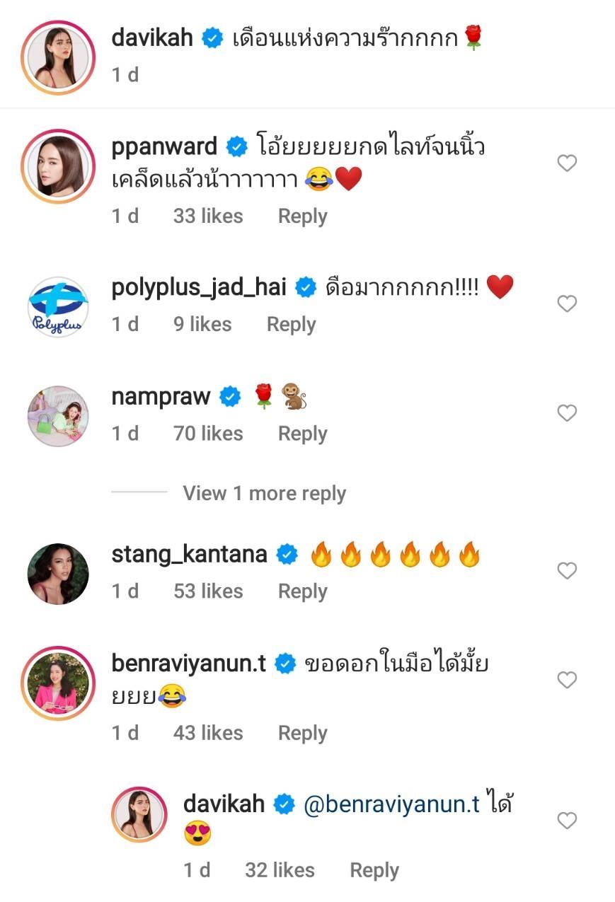 ท่ามกลางคอมเมนต์แซวจากแฟนๆ ที่ต่างบอกว่าสวยเผ็ชมาก เอาใจไปเลยจ้า พร้อมทั้งส่งอีโมจิไฟลุกกับหัวใจเต็มไอจี รวมไปถึง เป้ย ปานวาด ที่ยังต้องคอมเมนต์ว่า “โอ้ยยยยยกดไลท์จนนิ้วเคล็ดแล้วน้าาาาาาา” และดูเหมือนภาพนี้จะถูกใจแฟนๆ หนักมาก แห่กดไลค์มากกว่า 5 แสนไลค์เลยทีเดียว.