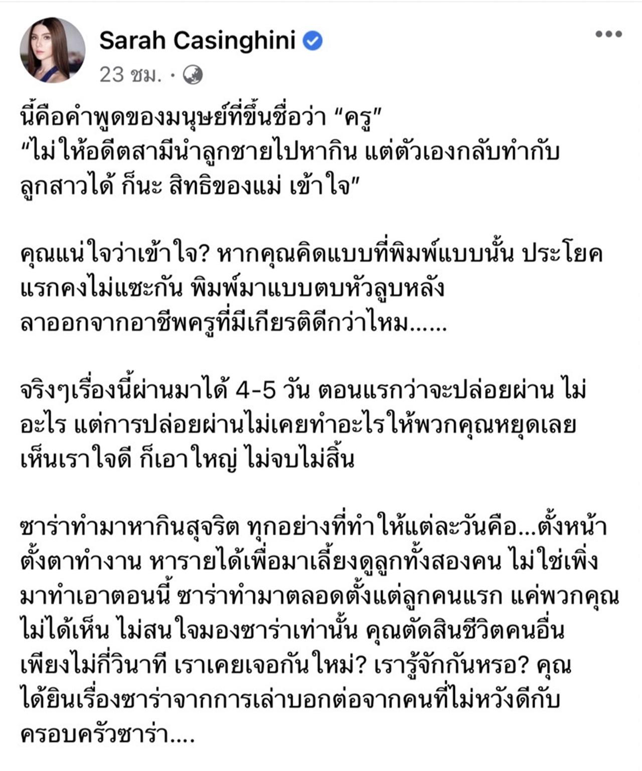ในส่วนของการตั้งคำถาม “ทำไมไม่ให้สิทธิ์กับพ่อเด็ก” ซาร่าขอไม่ลงรายละเอียดอะไร มันจบแล้ว ศาลตัดสินแล้ว ช่วยเคารพคำสั่งศาลกันด้วยค่ะ".