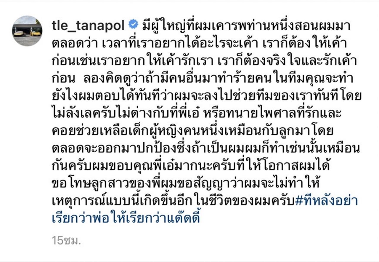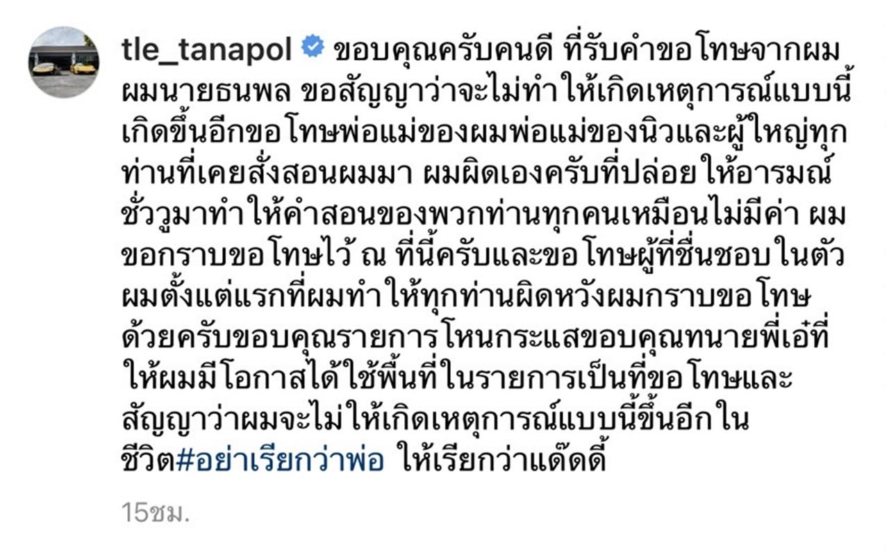ผมขอกราบขอโทษไว้ ณ ที่นี้ครับและขอโทษผู้ที่ชื่นชอบในตัวผมตั้งแต่แรก ที่ผมทำให้ทุกท่านผิดหวัง ผมกราบขอโทษด้วยครับ ขอบคุณรายการโหนกระแส ขอบคุณทนายพี่เอ๋ ที่ให้ผมมีโอกาสได้ใช้พื้นที่ในรายการเป็นที่ขอโทษ และสัญญาว่าผมจะไม่ให้เกิดเหตุการณ์แบบนี้ขึ้นอีกในชีวิต #อย่าเรียกว่าพ่อ ให้เรียกว่าแด๊ดดี้"