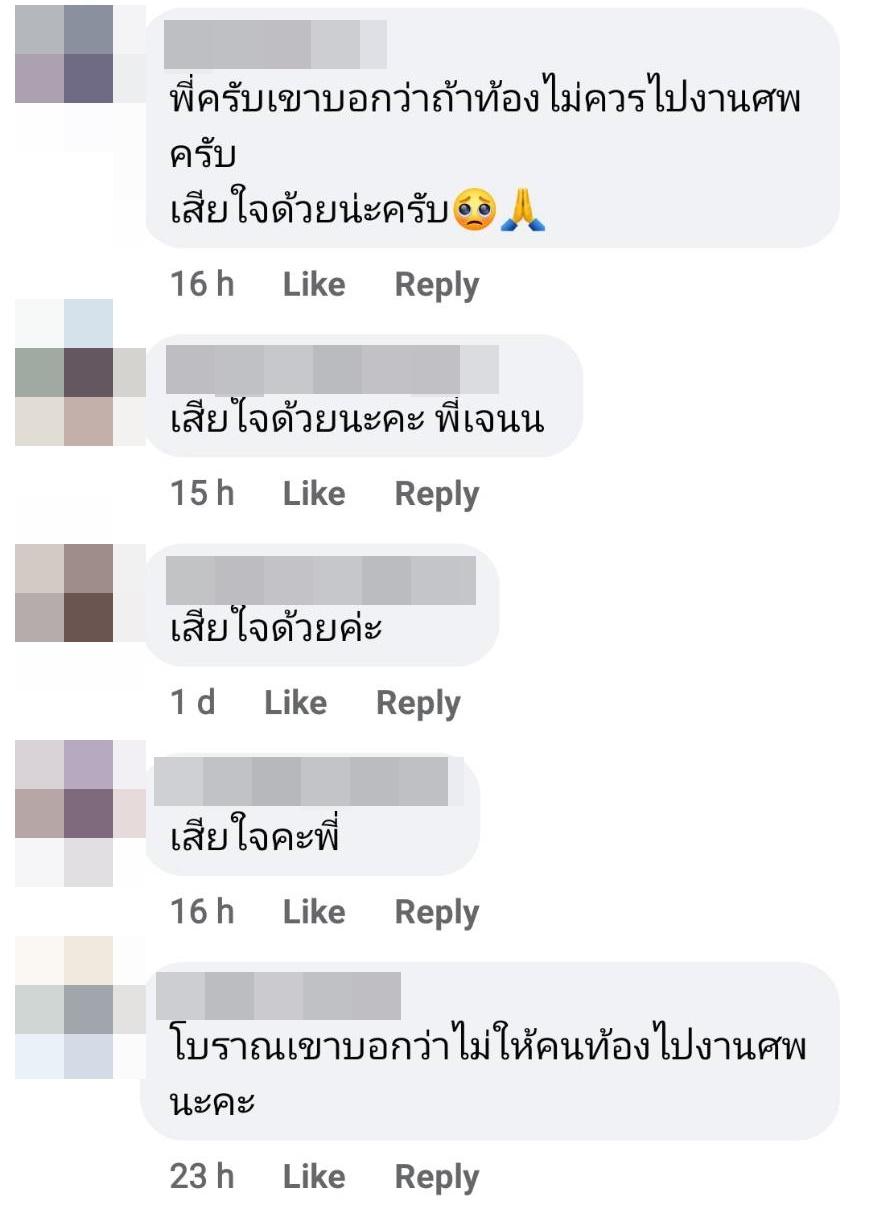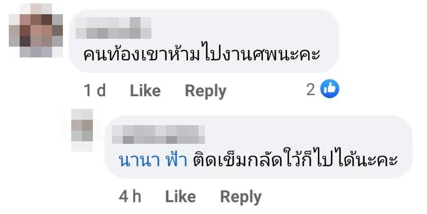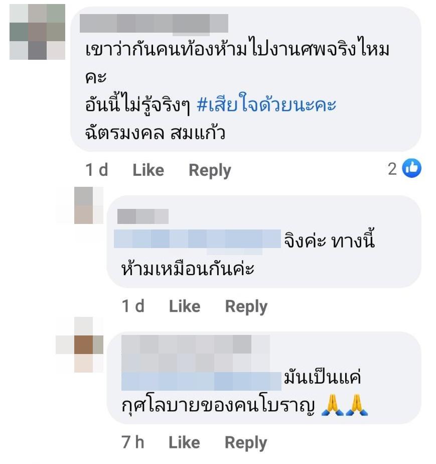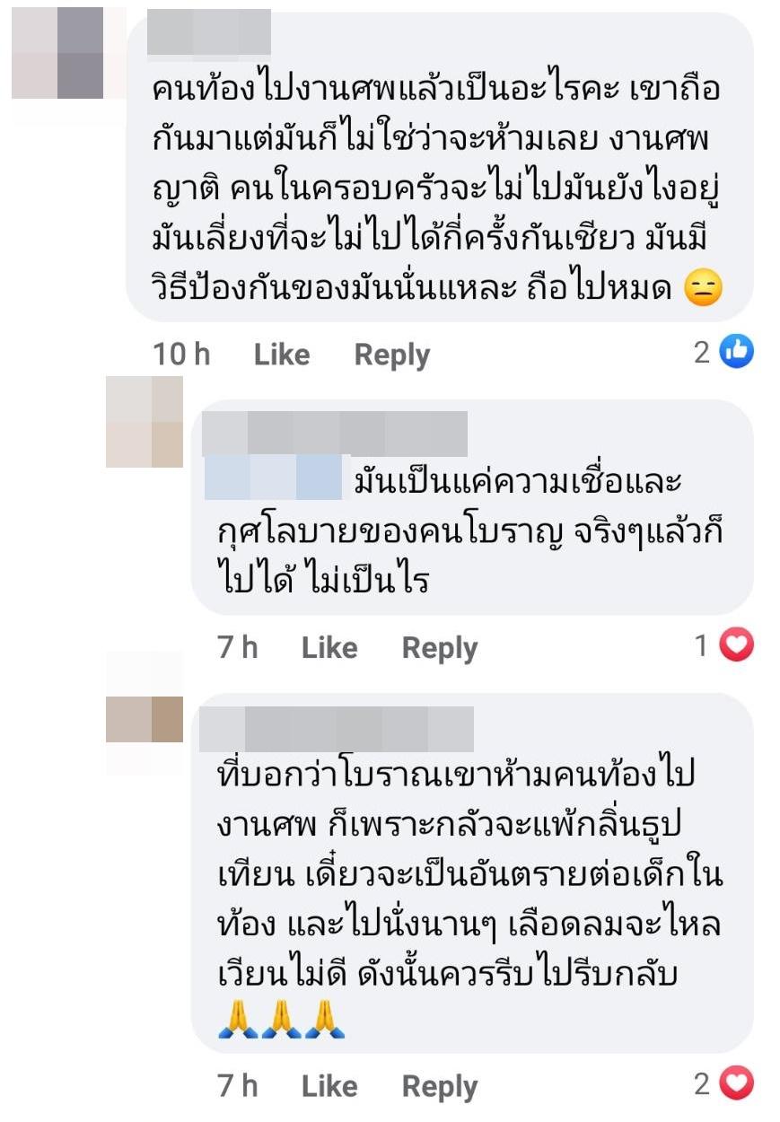 แต่งานนี้ก็มีชาวเน็ตบางส่วนคอมเมนต์เตือนว่าคนท้องไม่ควรไปร่วมงานศพ เพราะความเชื่อคนโบราณ การไปร่วมงานศพอาจเกิดสิ่งไม่ดีกับทารกในครรภ์ อาจมีวิญญาณที่อยากมาอาศัยเกิด แต่หากจำเป็นต้องไปจริงๆ ก็ให้ติดเข็มกลัดเพื่อป้องกัน โดยนำเข็มกลัดซ่อนปลายมากลัดไว้ที่เสื้อบริเวณท้องเวลาที่ต้องไปงานศพด้วย แต่ก็มีชาวเน็ตบางคนที่บอกว่าเป็นกุศโลบายของคนโบราณ กลัวว่าคนท้องจะแพ้กลิ่นธูปเทียน อาจเป็นอันตรายกับเด็กในท้อง ไปนั่งนานๆ เลือดลมอาจไหลเวียนไม่ดี ฯลฯ
