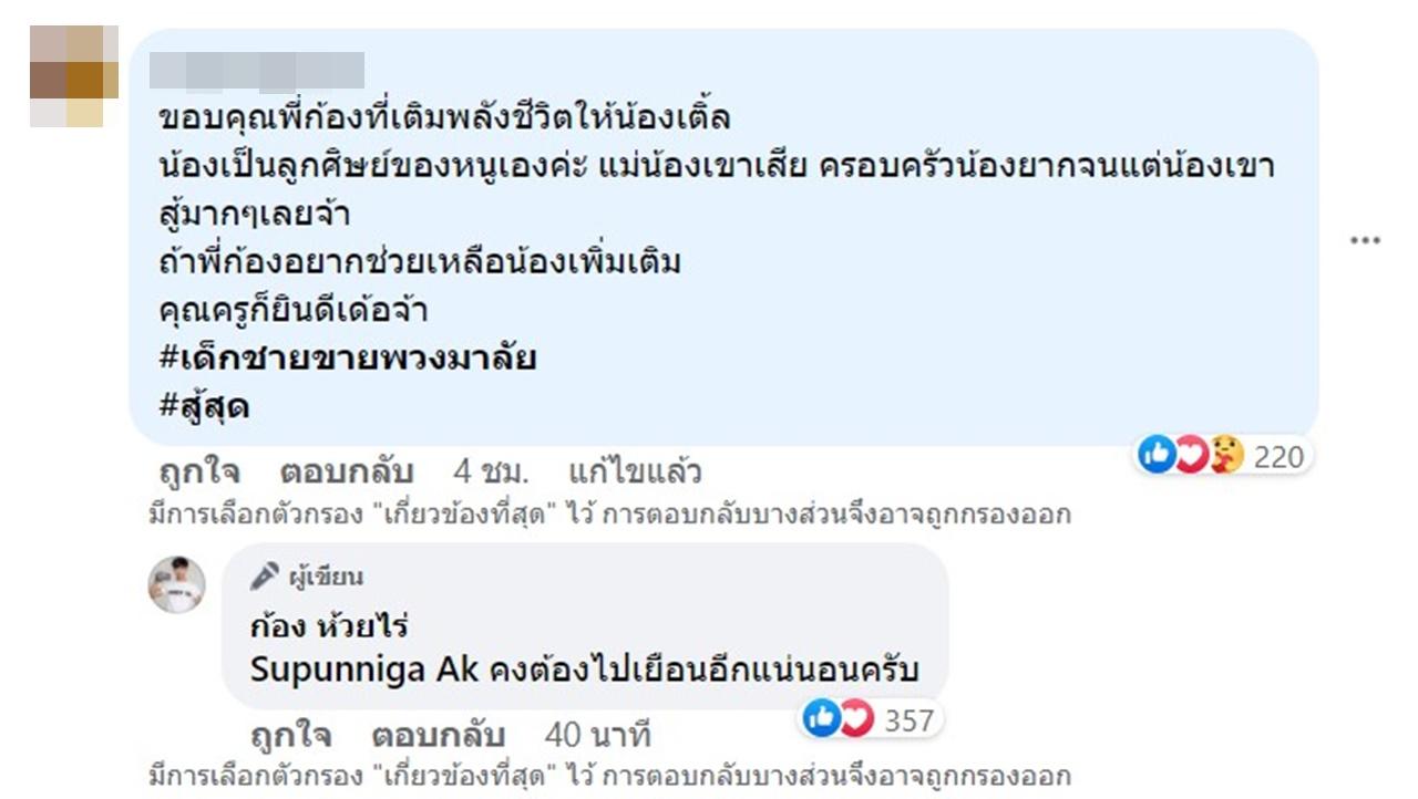 และในคลิปดังกล่าว ก็ได้มีคุณครูของเด็กชายขายพวงมาลัยเข้ามาคอมเมนต์ถึง ก้อง ว่า "ขอบคุณพี่ก้องที่เติมพลังชีวิตให้น้องเติ้ล น้องเป็นลูกศิษย์ของหนูเองค่ะ แม่น้องเขาเสีย ครอบครัวน้องยากจนแต่น้องเขาสู้มากๆเลยจ้า ถ้าพี่ก้องอยากช่วยเหลือน้องเพิ่มเติม คุณครูก็ยินดีเด้อจ้า #เด็กชายขายพวงมาลัย #สู้สุด" และ ก้อง ได้มาตอบว่า "คงต้องไปเยือนอีกแน่นอนครับ".