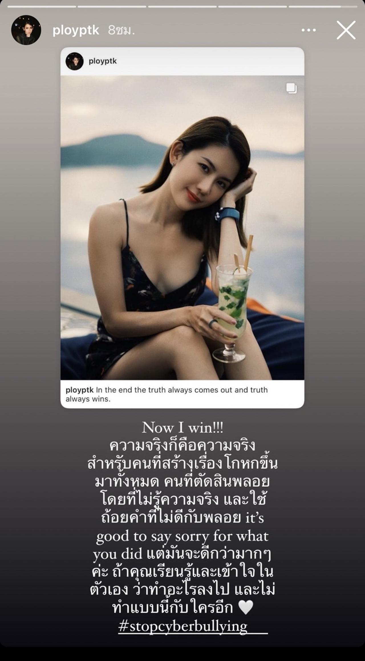 อีกทั้งยังโพสต์ไอจีสตอรี่ และเขียนข้อความว่า "Now I win!!! ความจริงก็คือความจริง สำหรับคนที่สร้างเรื่องโกหกขึ้นโดยที่ไม่รู้ความจริง และใช้ถ้อยคำที่ไม่ดีกับพลอย it's good to say sorry for what you did แต่มันจะดีกว่ามากๆ ค่ะ ถ้าคุณเรียนรู้และเข้าใจในตัวเอง ว่าทำอะไรลงไป และไม่ทำแบบนี้กับใคร #stopcyberbullying".