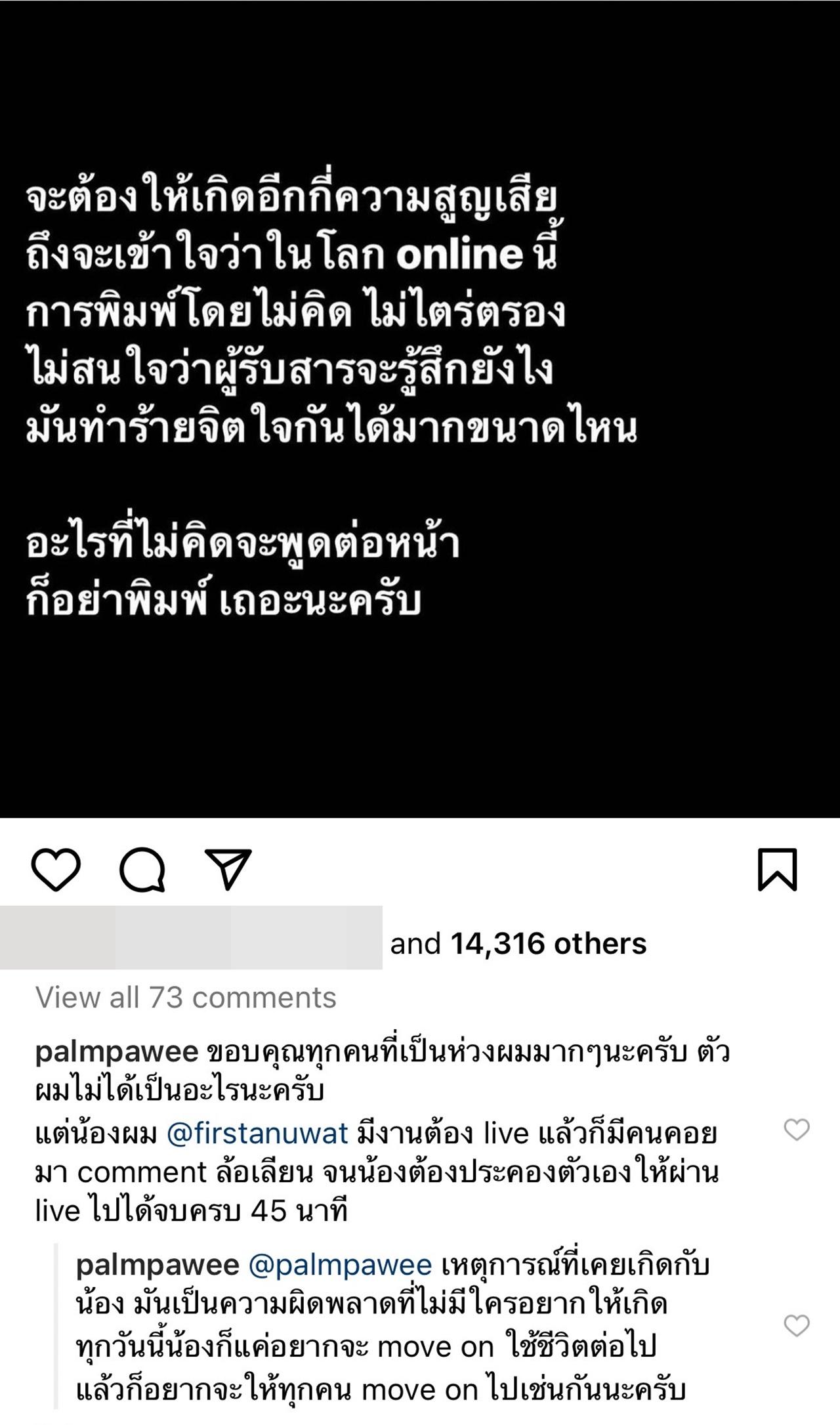 โดย ปาล์ม นั้น ได้โพสต์ข้อความลงในอินสตาแกรมของตัวเอง โดยเขียนว่า "จะต้องให้เกิดอีกกี่ความสูญเสียถึงจะเข้าใจว่าในโลก online นี้ การพิมพ์โดยไม่คิด ไม่ไตร่ตรอง ไม่สนใจว่าผู้รับสารจะรู้สึกยังไง มันทำร้ายจิตใจกันได้มากขนาดไหน อะไรที่ไม่คิดจะพูดต่อหน้า ก็อย่าพิมพ์เถอะนะครับ"