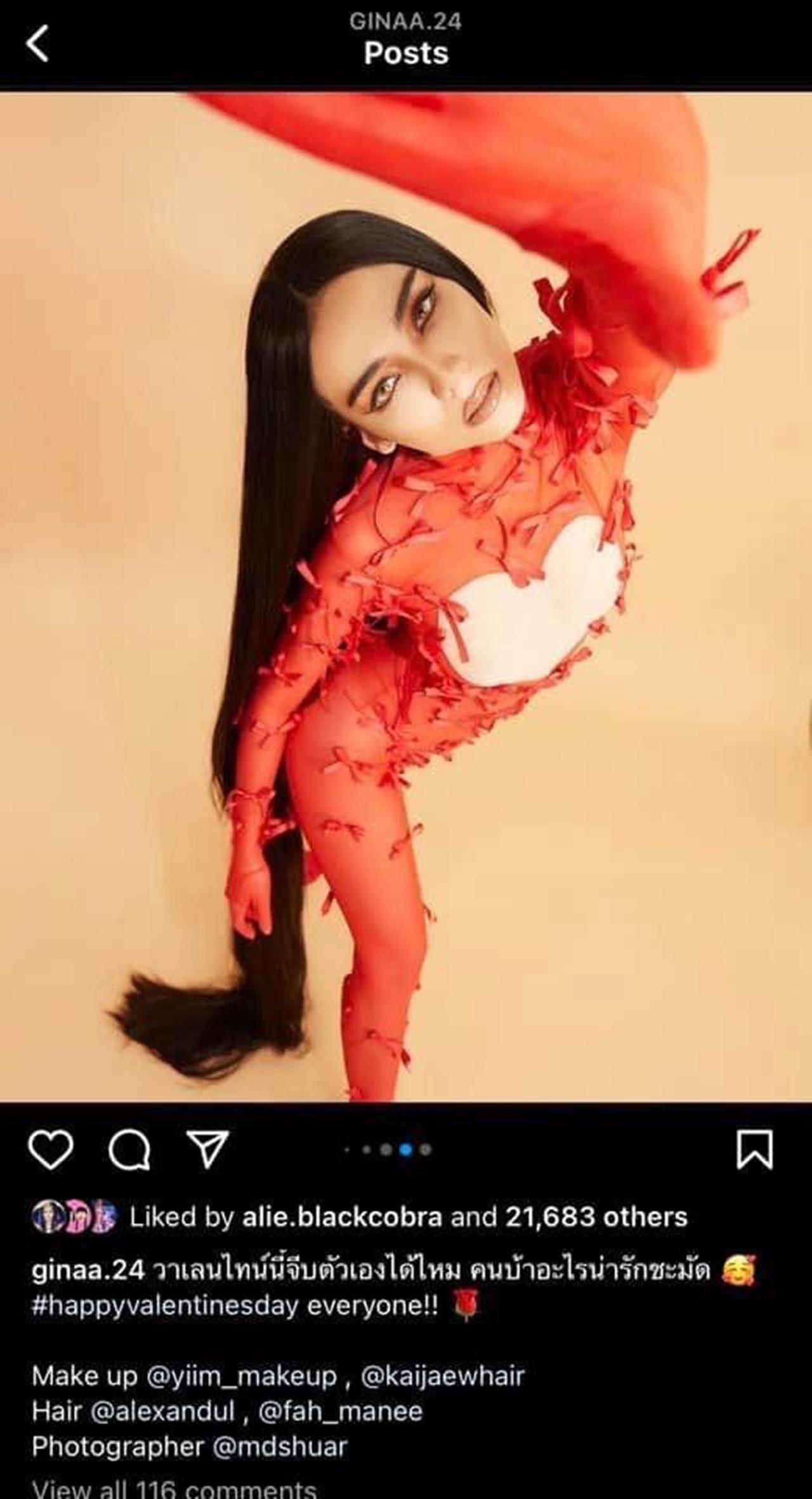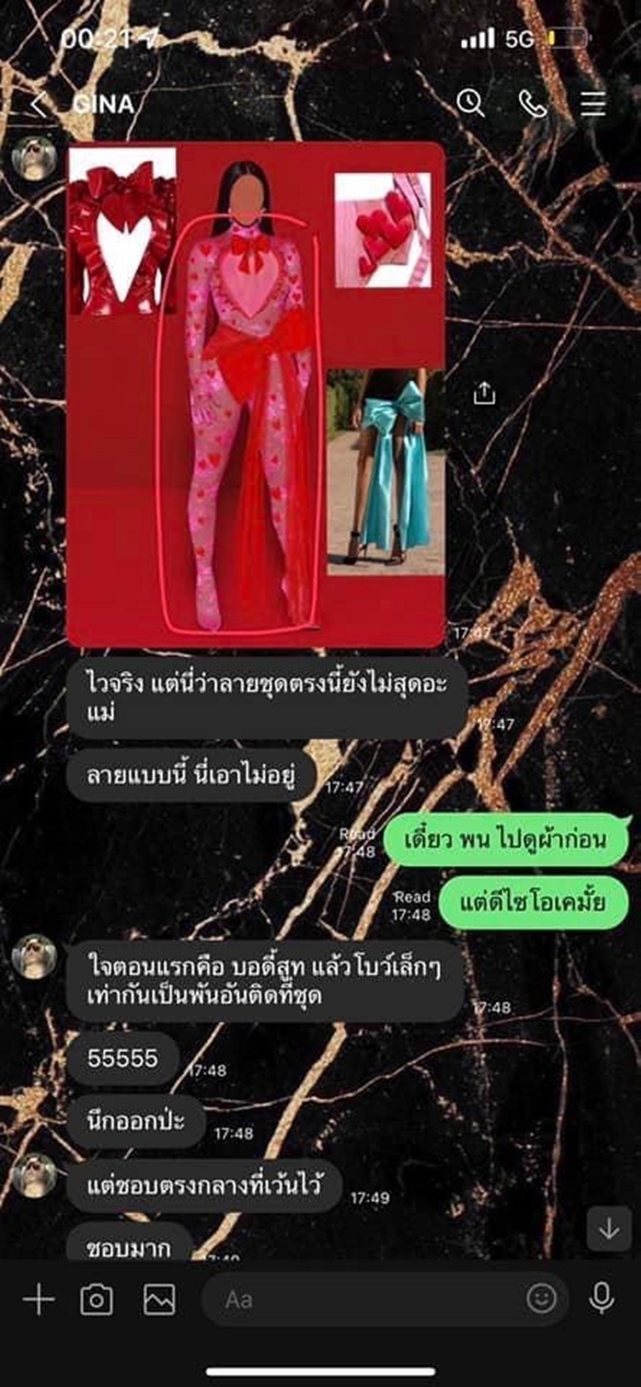 และโพสต์ข้อความที่ได้คุยกับ จีน่า เรื่องออกแบบชุดที่จะถ่ายแบบในวันวาเลนไทน์ ซึ่งชุดดังกล่าวเป็นชุดแบบที่ จีน่า อยากได้ และสไตลิสต์ก็ได้วาดออกมาตามแบบที่ จีน่า ต้องการ และแก้งานให้ตามที่ต้องการ ก่อนจะถามว่า ต้องการให้ตัดเลยมั้ย ซึ่ง จีน่า ก็บอกมาแต่เพียงว่าขอปรึกษาผู้จัดการส่วนตัวก่อน ก่อนที่จะหายไป