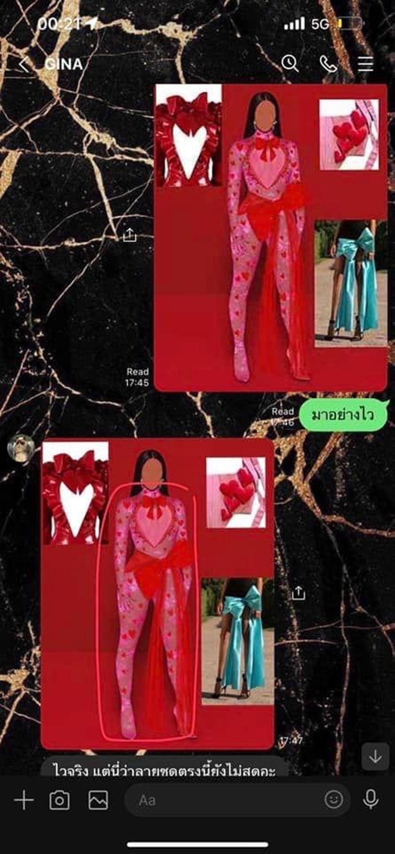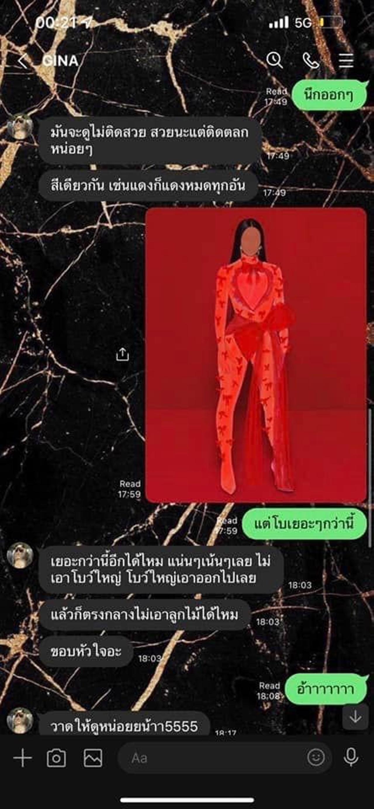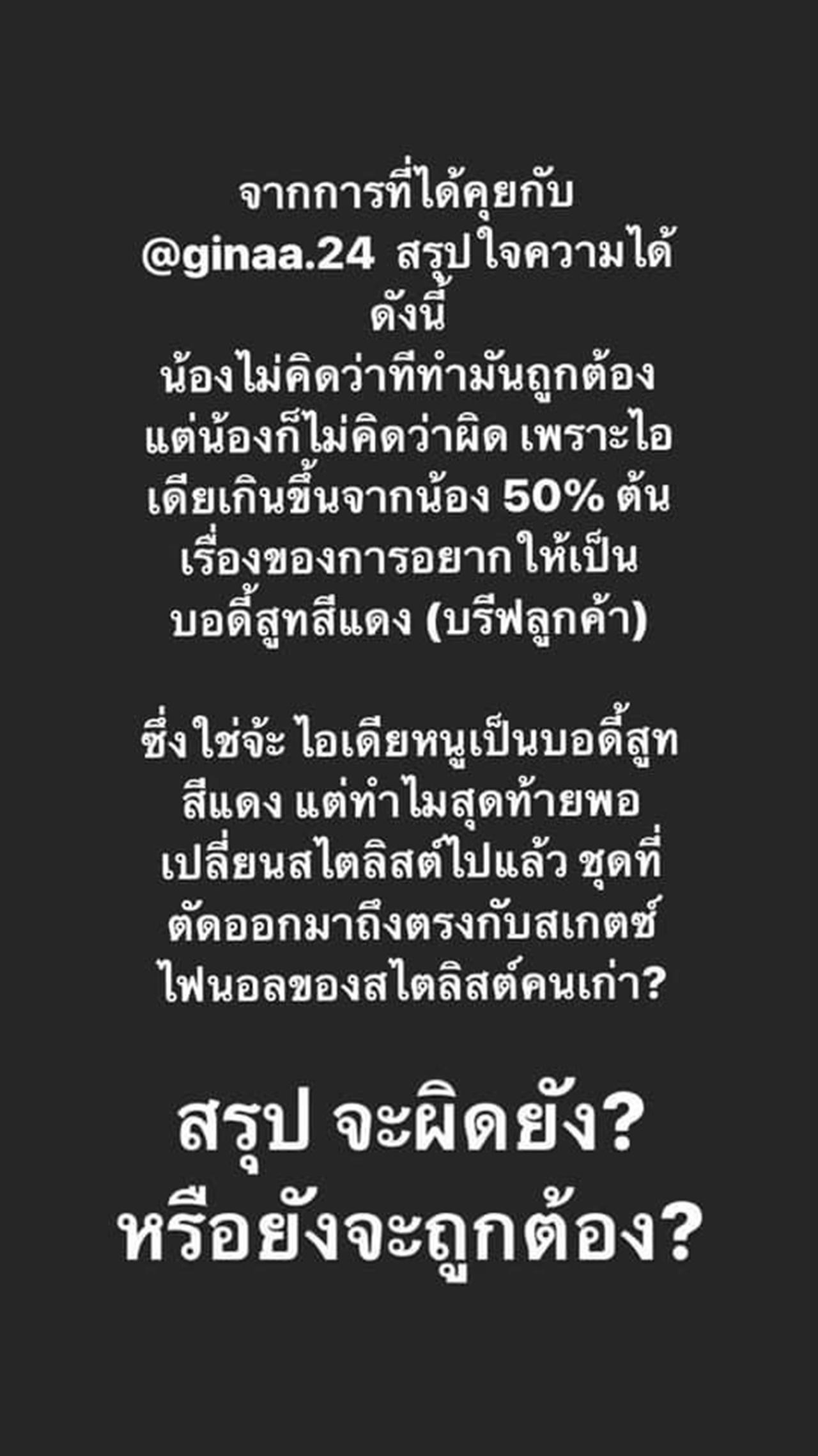แม้จะได้ทักไปคุยกันแล้ว แต่คำตอบก็ทำเอาเจ้าตัวควันออกหูเลยทีเดียว "จากการที่ได้คุยกับ @ginaa.24 สรุปใจความได้ดังนี้ น้องไม่คิดว่าที่ทำมันถูกต้อง แต่น้องก็ไม่คิดว่าผิด เพราะไอเดียเกิดขึ้นจากน้อง 50% ต้นเรื่องของการอยากให้เป็นบอดี้สูทสีแดง (บรีฟลูกค้า)