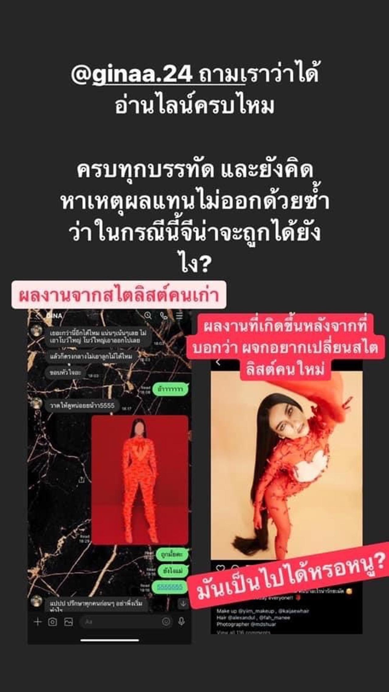 ทางด้าน ฮิปโป ก็ได้เผยภาพการออกแบบของสไตลิสต์คนเก่า เปรียบเทียบกับผลงานของสไตลิสต์คนใหม่ และเขียนข้อความว่า "ถามเราว่าได้อ่านไลน์ครบไหม ครบทุกบรรทัด และยังคิดหาเหตุผลแทนไม่ออกด้วยซ้ำว่าในกรณีนี้จีน่าจะถูกได้ยังไง? ผลงานที่เกิดขึ้นหลังจากที่บอกว่า ผจก.อยากเปลี่ยนสไตลิสต์คนใหม่ มันเป็นไปได้เหรอหนู"
