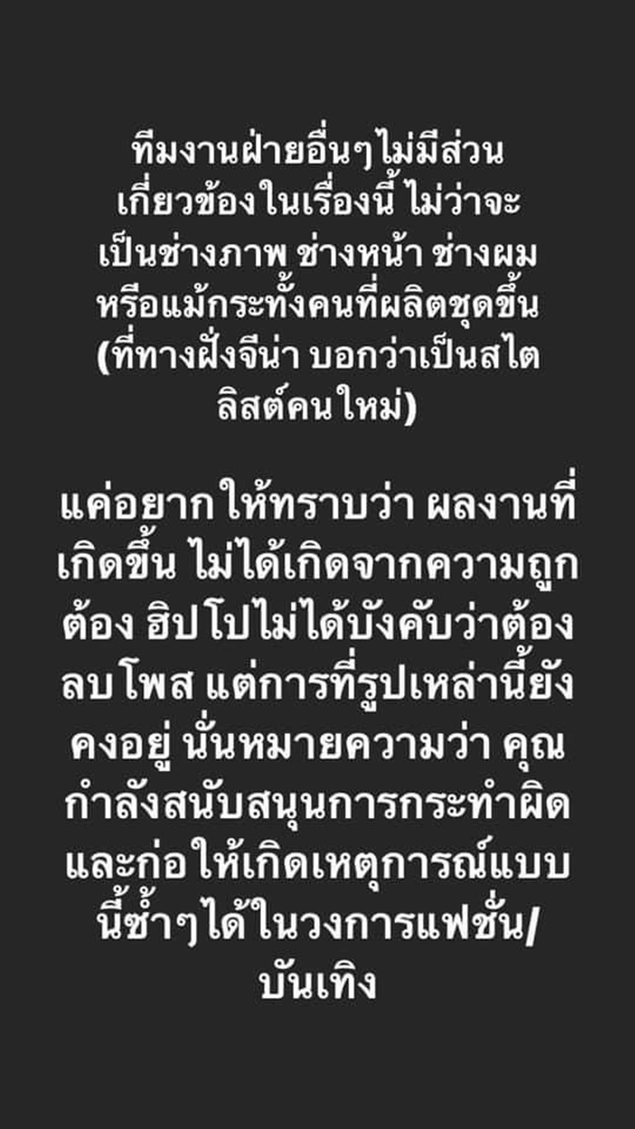 แต่การที่รูปเหล่านี้ยังคงอยู่ นั่นหมายความว่า คุณกำลังสนับสนุนการกระทำผิด และก่อให้เกิดเหตุการณ์แบบนี้ซ้ำๆ ได้ในวงการแฟชั่น/บันเทิง"