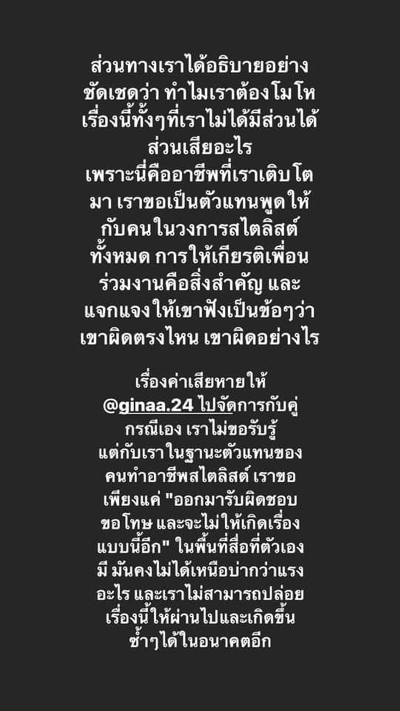 "ส่วนทางเราได้อธิบายอย่างชัดเจนว่า ทำไมเราต้องโมโหเรื่องนี้ ทั้งๆ ที่เราไม่ได้มีส่วนได้ส่วนเสียอะไร เพราะนี่คืออาชีพที่เราเติบโตมา เราขอเป็นตัวแทนพูดให้กับคนในวงการสไตลิสต์ทั้งหมด การให้เกียรติเพื่อนร่วมงานคือสิ่งสำคัญ และแจกแจงให้เขาฟังเป็นข้อๆ ว่าเขาผิดตรงไหน เขาผิดอย่างไร เรื่องค่าเสียหายให้ @ginaa.24 ไปจัดการกับคู่กรณีเอง เราไม่ขอรับรู้