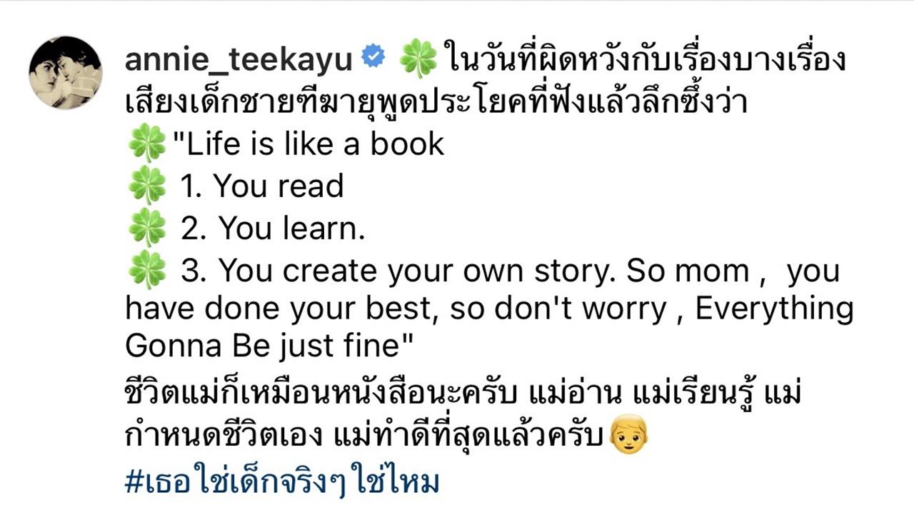 ล่าสุด แอนนี่ ก็ได้โพสต์ภาพคู่ลูกชาย พร้อมเขียนแคปชั่นที่ลูกชายได้พูดกับตนเองไว้ว่า "ในวันที่ผิดหวังกับเรื่องบางเรื่อง เสียงเด็กชายฑีฆายุพูดประโยคที่ฟังแล้วลึกซึ้งว่า "Life is like a book 1. You read 2. You learn. 3. You create your own story. So mom, you have done your best, so don't worry, Everything Gonna Be just fine" ชีวิตแม่ก็เหมือนหนังสือนะครับ แม่อ่าน แม่เรียนรู้ แม่กำหนดชีวิตเอง แม่ทำดีที่สุดแล้วครับ #เธอใช่เด็กจริงๆใช่ไหม"