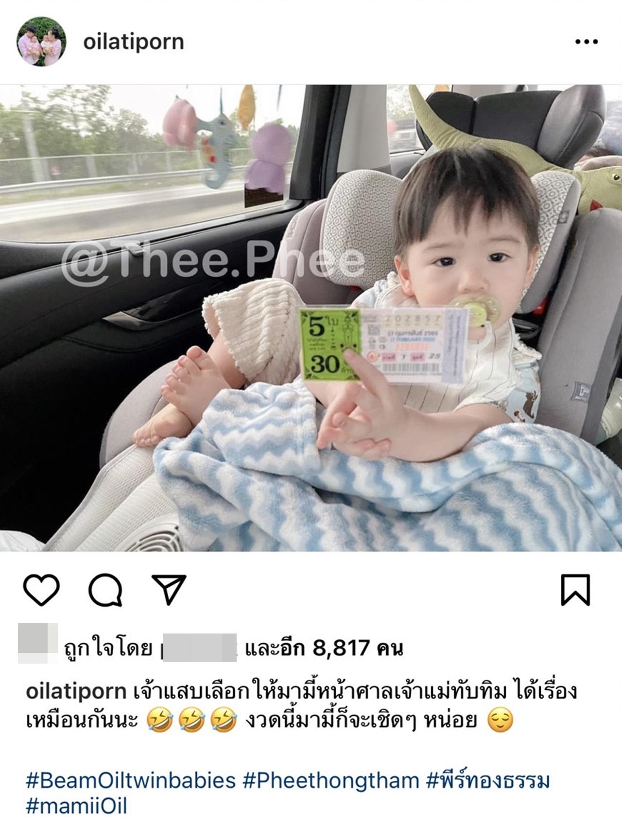 โดย แม่ออย ได้โพสต์ภาพลูกชาย น้องพีร์ กับลอตเตอรี่อีก 5 ใบ ที่มีเลขท้าย 57 พร้อมเขียนแคปชั่นว่า "เจ้าแสบเลือกให้มามี้หน้าศาลเจ้าแม่ทับทิม ได้เรื่องเหมือนกันนะ งวดนี้มามี้ก็จะเชิดๆ หน่อย #BeamOiltwinbabies #Pheethongtham #พีร์ทองธรรม #mamiiOil"